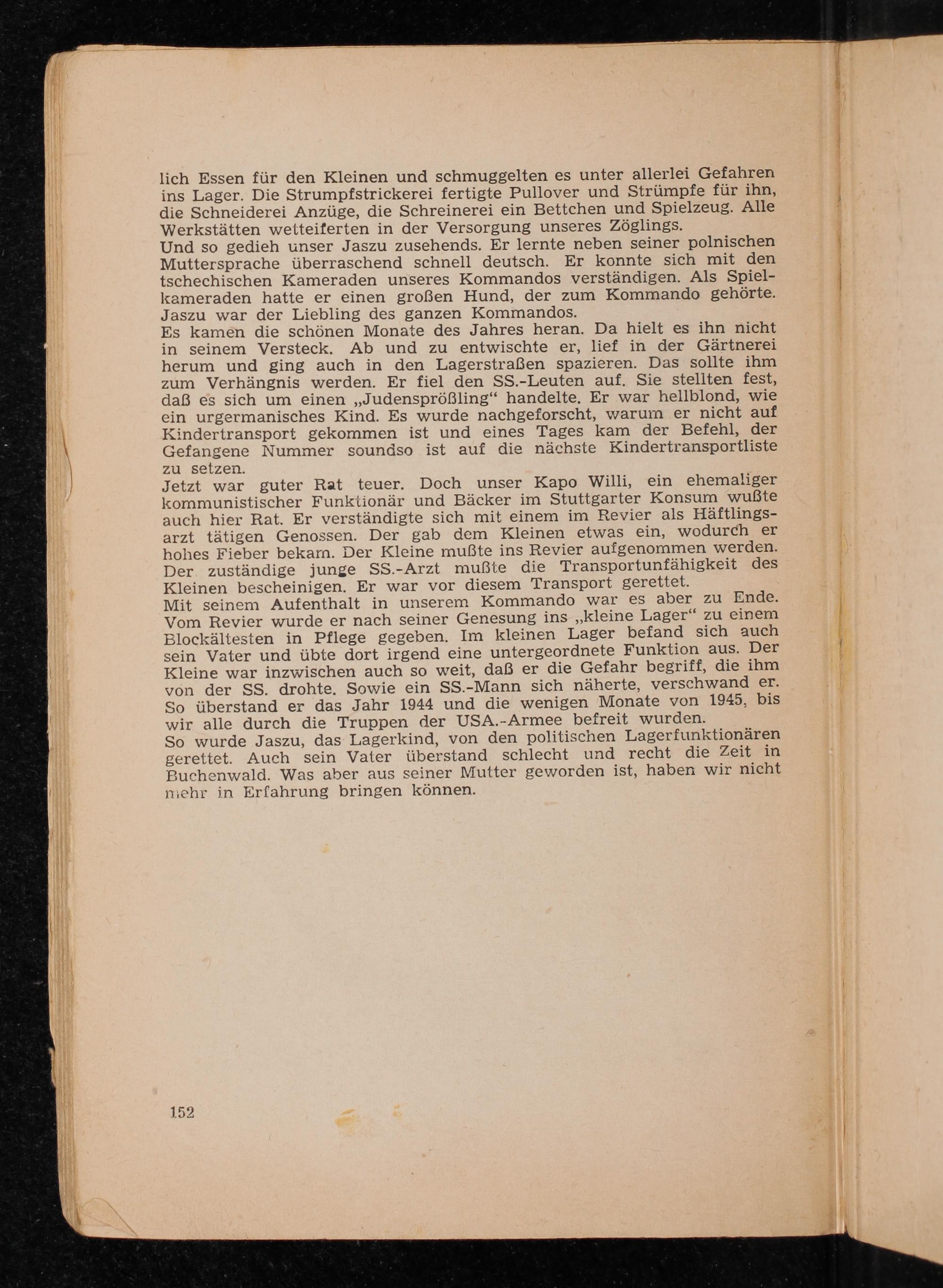 Jetzt war guter Rat teuer. Doch unser Kapo Willi, ein ehemaliger kommunistischer Funktionär und Bäcker im Stuttgarter Konsum wußte auch hier Rat. Er verständigte sich mit einem im Revier als Häftlingsarzt tätigen Genossen. Der gab dem Kleinen etwas ein, wodurch er hohes Fieber bekam. Der Kleine mußte ins Revier aufgenommen werden. Der zuständige junge SS. - Arzt mußte die Transportunfähigkeit des Kleinen bescheinigen. Er war vor diesem Transport gerettet. Mit seinem Aufenthalt in unserem Kommando war es aber zu Ende. Vom Revier wurde er nach seiner Genesung ins ,, kleine Lager" zu einem Blockältesten in Pflege gegeben. Im kleinen Lager befand sich auch sein Vater und übte dort irgend eine untergeordnete Funktion aus. Der Kleine war inzwischen auch so weit, daß er die Gefahr begriff, die ihm von der SS. drohte. Sowie ein SS.- Mann sich näherte, verschwand er. So überstand er das Jahr 1944 und die wenigen Monate von 1945, bis wir alle durch die Truppen der USA. - Armee befreit wurden. So wurde Jaszu, das Lagerkind, von den politischen Lagerfunktionären gerettet. Auch sein Vater überstand schlecht und recht die Zeit in Buchenwald . Was aber aus seiner Mutter geworden ist, haben wir nicht mehr in Erfahrung bringen können.