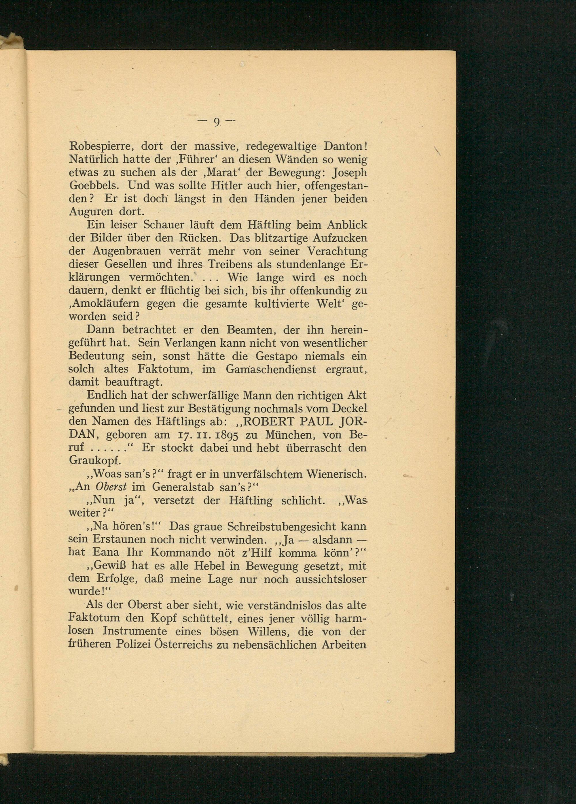 Endlich hat der schwerfällige Mann den richtigen Akt gefunden und liest zur Bestätigung nochmals vom Deckel den Namen des Häftlings ab: ,, ROBERT PAUL JORDAN, geboren am 17. 11. 1895 zu München , von Beruf......" Er stockt dabei und hebt überrascht den Graukopf.
