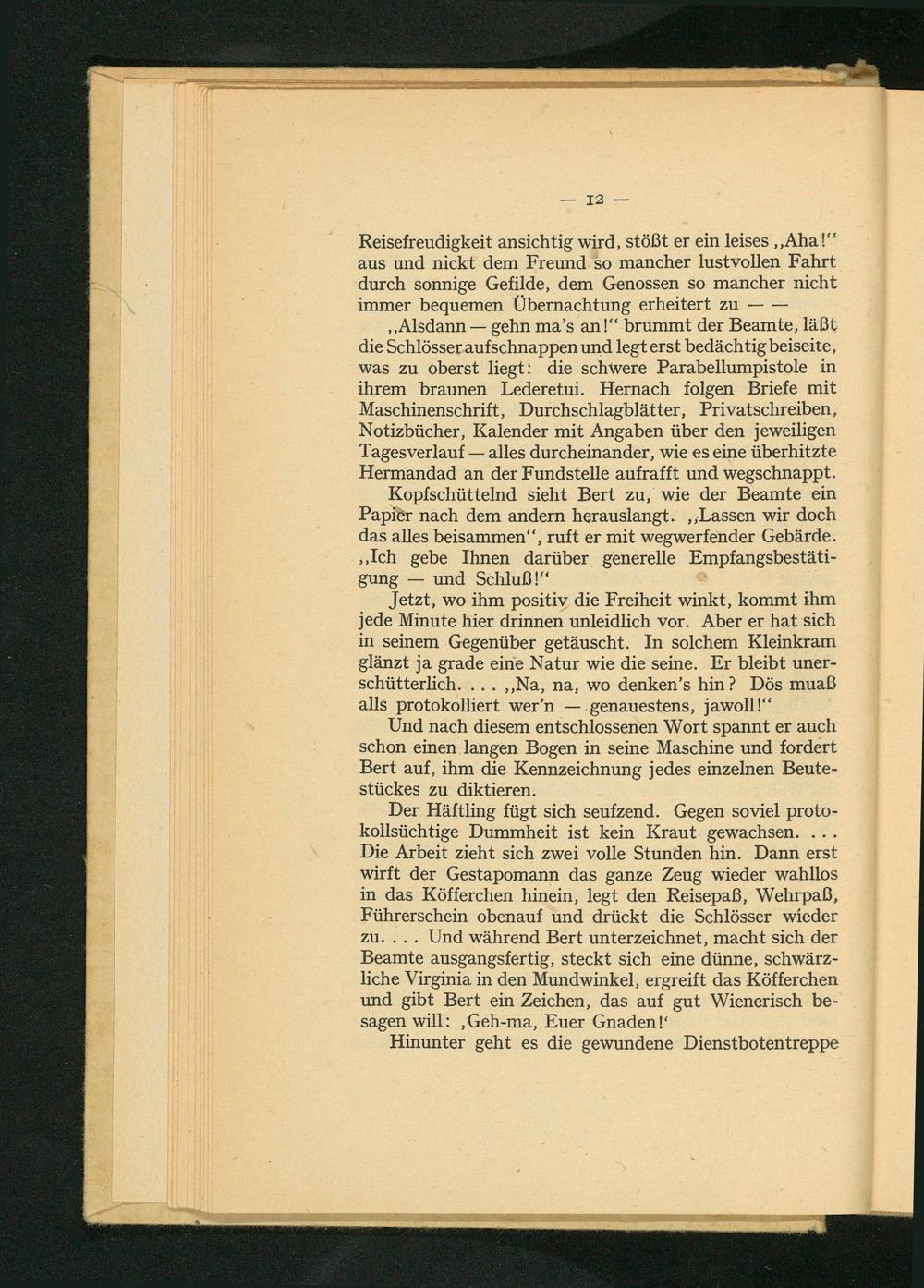 Der Häftling fügt sich seufzend. Gegen soviel protokollsüchtige Dummheit ist kein Kraut gewachsen. Die Arbeit zieht sich zwei volle Stunden hin. Dann erst wirft der Gestapomann das ganze Zeug wieder wahllos in das Köfferchen hinein, legt den Reisepaẞ, Wehrpaß, Führerschein obenauf und drückt die Schlösser wieder zu.... Und während Bert unterzeichnet, macht sich der Beamte ausgangsfertig, steckt sich eine dünne, schwärzliche Virginia in den Mundwinkel, ergreift das Köfferchen und gibt Bert ein Zeichen, das auf gut Wienerisch besagen will:, Geh- ma, Euer Gnaden!"