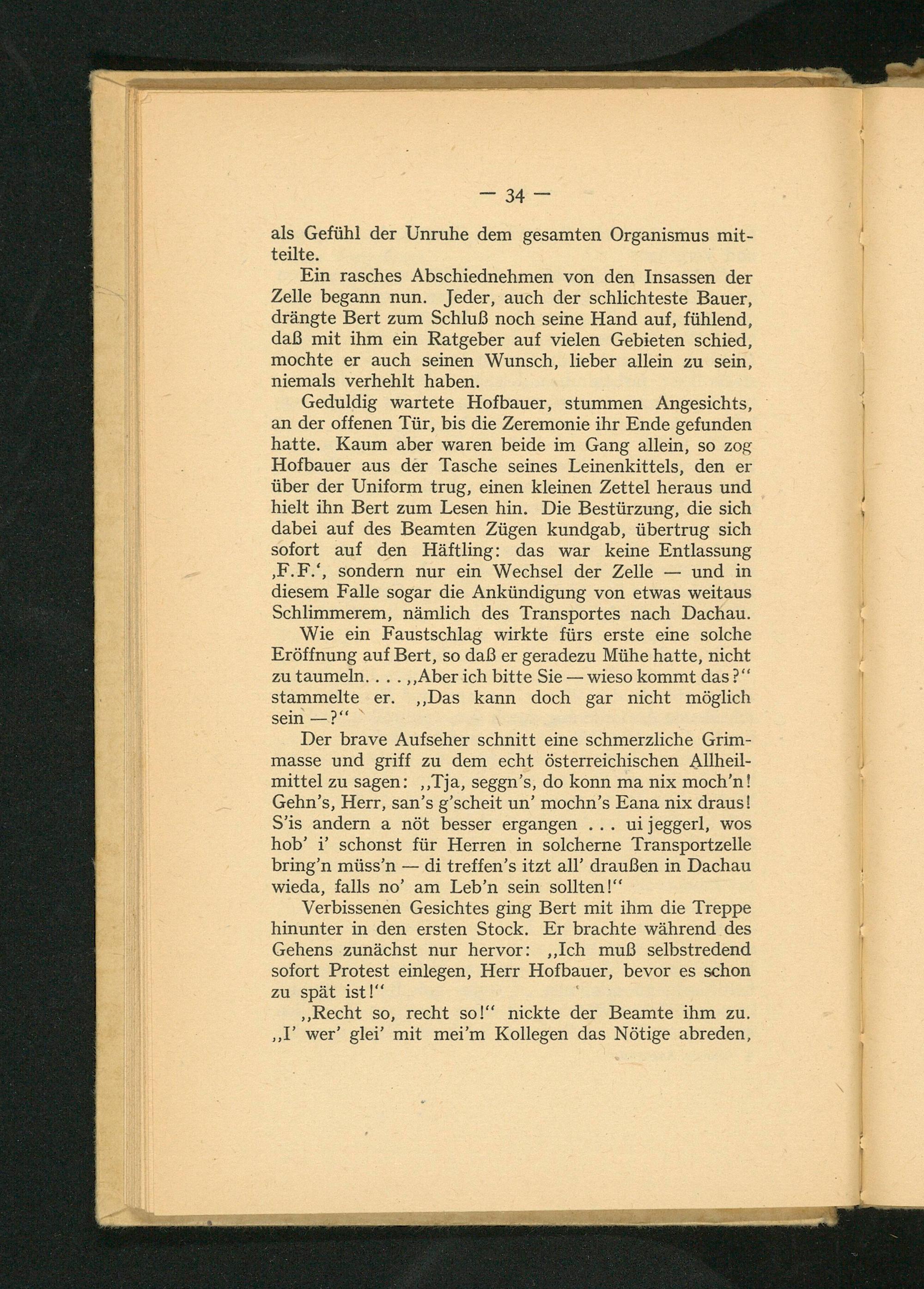 Geduldig wartete Hofbauer, stummen Angesichts, an der offenen Tür, bis die Zeremonie ihr Ende gefunden hatte. Kaum aber waren beide im Gang allein, so zog Hofbauer aus der Tasche seines Leinenkittels, den er über der Uniform trug, einen kleinen Zettel heraus und hielt ihn Bert zum Lesen hin. Die Bestürzung, die sich dabei auf des Beamten Zügen kundgab, übertrug sich sofort auf den Häftling: das war keine Entlassung , F.F.', sondern nur ein Wechsel der Zelle und in diesem Falle sogar die Ankündigung von etwas weitaus Schlimmerem, nämlich des Transportes nach Dachau .