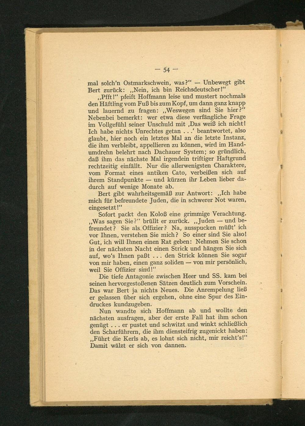 Sofort packt den Koloß eine grimmige Verachtung. ,, Was sagen Sie?" brüllt er zurück. ,, Juden- und befreundet? Sie als Offizier? Na, ausspucken müßt' ich vor Ihnen, verstehen Sie mich? So einer sind Sie also! Gut, ich will Ihnen einen Rat geben: Nehmen Sie schon in der nächsten Nacht einen Strick und hängen Sie sich auf, wo's Ihnen paßt... den Strick können Sie sogar von mir haben, einen ganz soliden- von mir persönlich, weil Sie Offizier sind!"