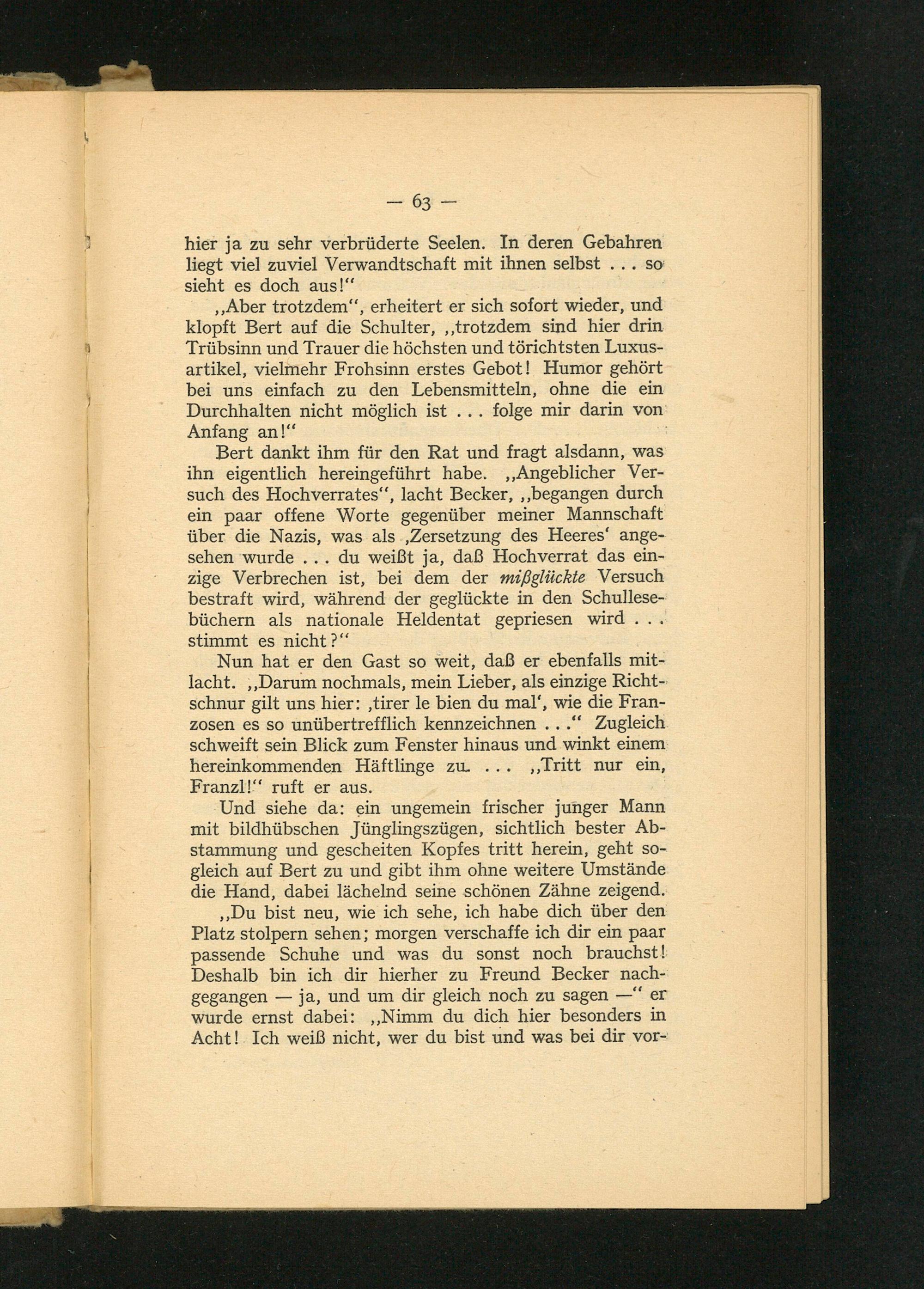 Bert dankt ihm für den Rat und fragt alsdann, was ihn eigentlich hereingeführt habe. ,, Angeblicher Versuch des Hochverrates", lacht Becker ,,, begangen durch ein paar offene Worte gegenüber meiner Mannschaft über die Nazis, was als, Zersetzung des Heeres' angesehen wurde... du weißt ja, daß Hochverrat das einzige Verbrechen ist, bei dem der mißglückte Versuch bestraft wird, während der geglückte in den Schullesebüchern als nationale Heldentat gepriesen wird... stimmt es nicht?"