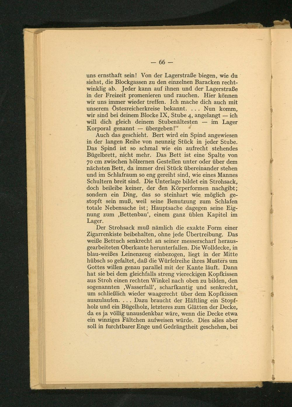 Der Strohsack muß nämlich die exakte Form einer Zigarrenkiste beibehalten, ohne jede Übertreibung. Das weiße Bettuch senkrecht an seiner messerscharf herausgearbeiteten Oberkante herunterfallen. Die Wolldecke, in blau- weißes Leinenzeug einbezogen, liegt in der Mitte hübsch so gefaltet, daß die Würfelreihe ihres Musters um Gottes willen genau parallel mit der Kante läuft. Dann hat sie bei dem gleichfalls streng viereckigen Kopfkissen aus Stroh einen rechten Winkel nach oben zu bilden, den sogenannten, Wasserfall', scharfkantig und senkrecht, um schließlich wieder waagerecht über dem Kopfkissen auszulaufen.... Dazu braucht der Häftling ein Stopfholz und ein Bügelholz, letzteres zum Glätten der Decke, da es ja völlig unausdenkbar wäre, wenn die Decke etwa ein winziges Fältchen aufweisen würde. Dies alles aber soll in furchtbarer Enge und Gedrängtheit geschehen, bei