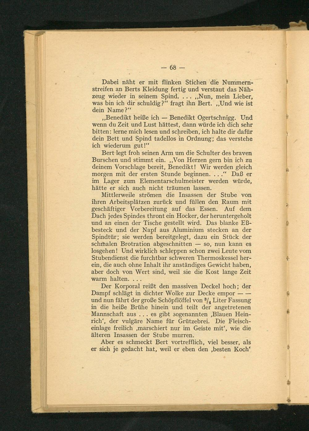 ,, Benedikt heiße ich- Benedikt Ogertschnigg. Und wenn du Zeit und Lust hättest, dann würde ich dich sehr bitten: lerne mich lesen und schreiben, ich halte dir dafür dein Bett und Spind tadellos in Ordnung; das verstehe ich wiederum gut!"