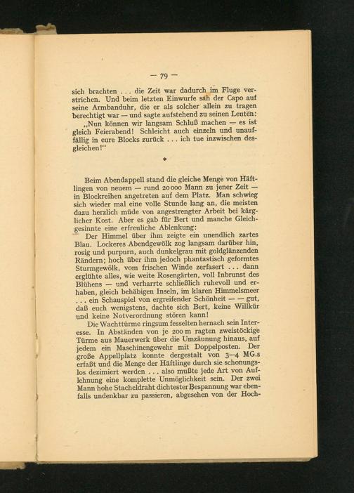 Beim Abendappell stand die gleiche Menge von Häftlingen von neuem rund 20000 Mann zu jener Zeit in Blockreihen angetreten auf dem Platz. Man schwieg sich wieder mal eine volle Stunde lang an, die meisten dazu herzlich müde von angestrengter Arbeit bei kärglicher Kost. Aber es gab für Bert und manche Gleichgesinnte eine erfreuliche Ablenkung: