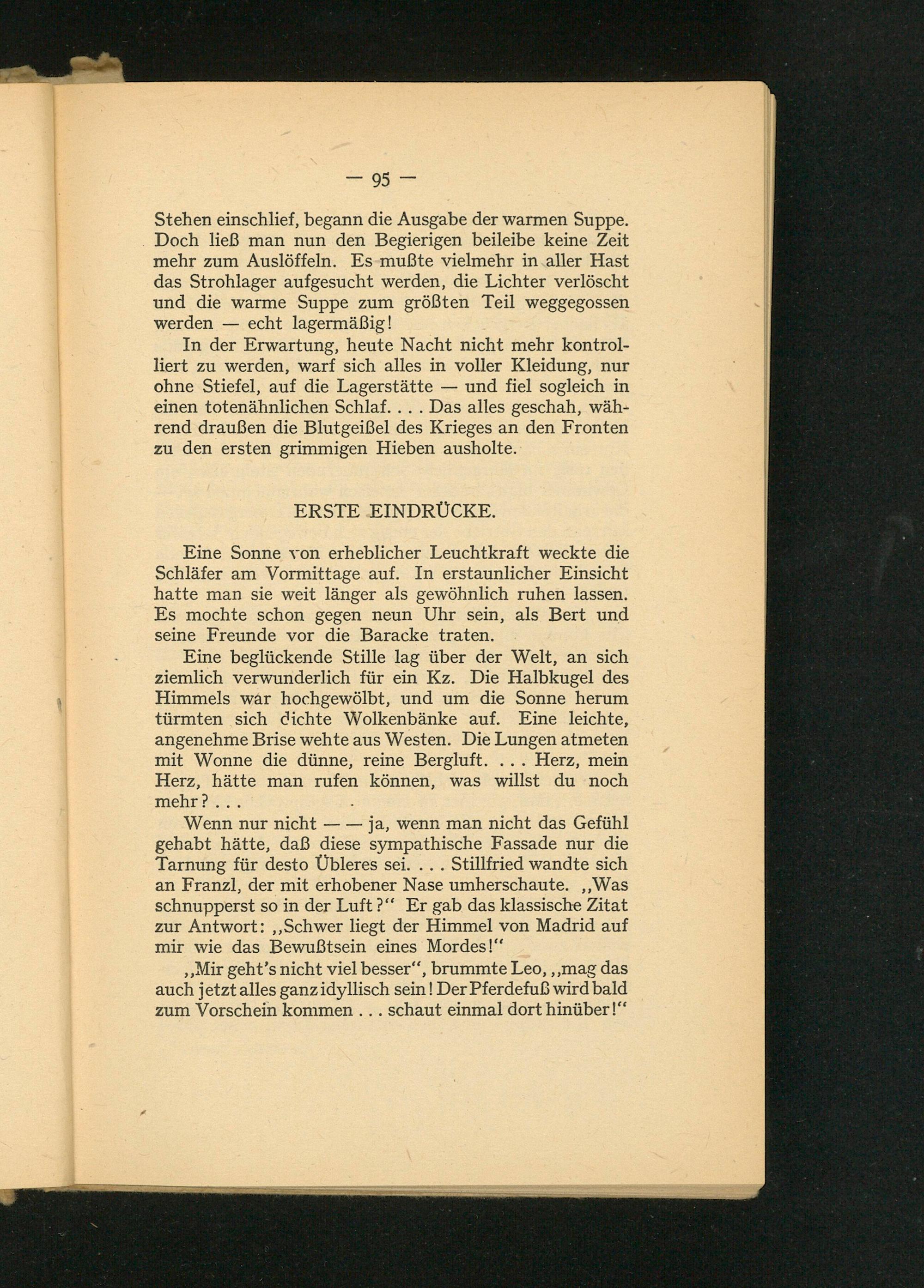 Eine beglückende Stille lag über der Welt, an sich ziemlich verwunderlich für ein Kz. Die Halbkugel des Himmels war hochgewölbt, und um die Sonne herum türmten sich dichte Wolkenbänke auf. Eine leichte, angenehme Brise wehte aus Westen. Die Lungen atmeten mit Wonne die dünne, reine Bergluft. Herz, mein Herz, hätte man rufen können, was willst du noch mehr?...