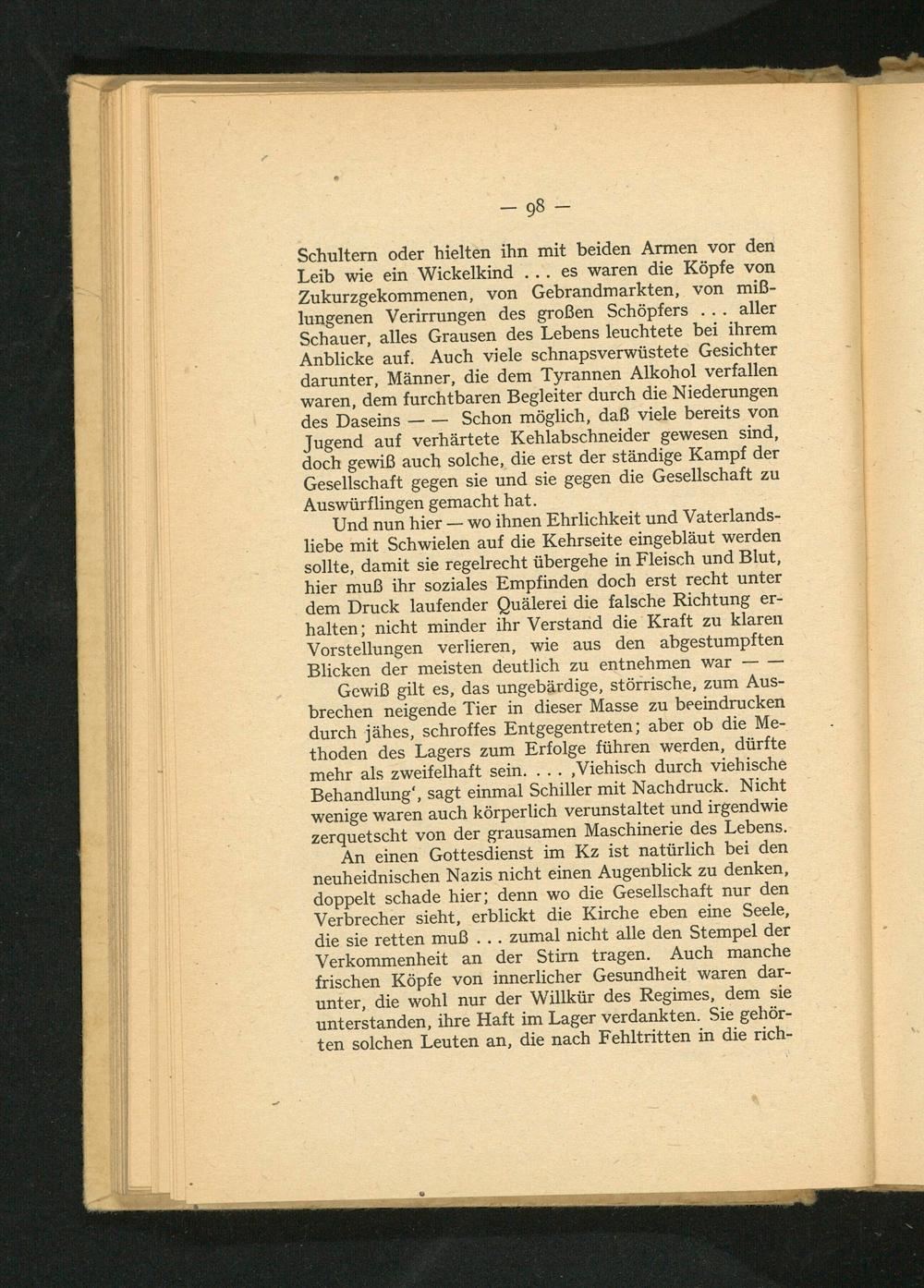 An einen Gottesdienst im Kz ist natürlich bei den neuheidnischen Nazis nicht einen Augenblick zu denken, doppelt schade hier; denn wo die Gesellschaft nur den Verbrecher sieht, erblickt die Kirche eben eine Seele, die sie retten muß... zumal nicht alle den Stempel der Auch manche Verkommenheit an der Stirn tragen. frischen Köpfe von innerlicher Gesundheit waren darunter, die wohl nur der Willkür des Regimes, dem sie unterstanden, ihre Haft im Lager verdankten. Sie gehörten solchen Leuten an, die nach Fehltritten in die rich