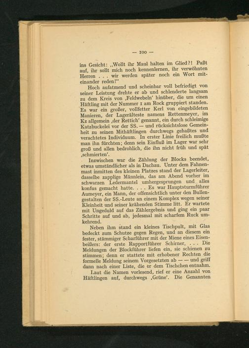 Hoch aufatmend und scheinbar voll befriedigt von seiner Leistung drehte er ab und schlenderte langsam zu dem Kreis von, Feldwebeln' hinüber, die um einen Häftling mit der Nummer I am Rock gruppiert standen. Es war ein großer, vollfetter Kerl von eingebildeten Manieren, der Lagerälteste namens Rettenmeyer, im Kz allgemein, der Rettich' genannt, ein durch schleimige Katzbuckelei vor der SS. und rücksichtslose Gemeinheit zu seinen Mithäftlingen durchwegs gehaẞtes und verachtetes Individuum. In erster Linie freilich mußte man ihn fürchten; denn sein Einfluß im Lager war sehr groß und allen bedrohlich, die ihn nicht früh und spät , schmierten'.