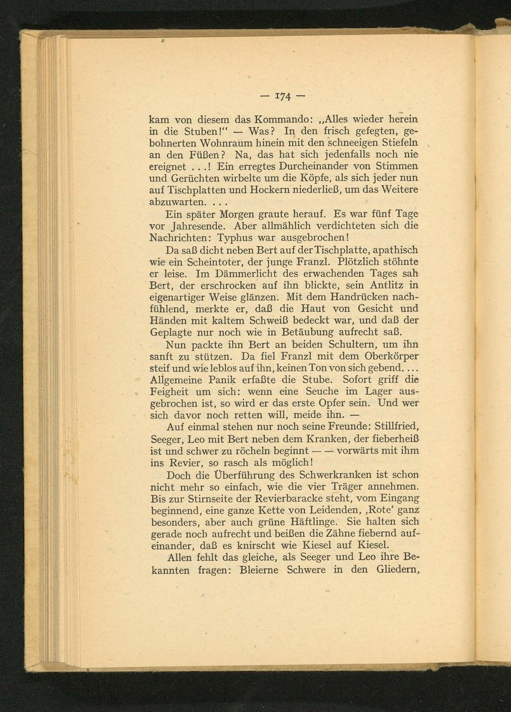 Da saß dicht neben Bert auf der Tischplatte, apathisch wie ein Scheintoter, der junge Franzl. Plötzlich stöhnte er leise. Im Dämmerlicht des erwachenden Tages sah Bert, der erschrocken auf ihn blickte, sein Antlitz in eigenartiger Weise glänzen. Mit dem Handrücken nachfühlend, merkte er, daß die Haut von Gesicht und Händen mit kaltem Schweiß bedeckt war, und daß der Geplagte nur noch wie in Betäubung aufrecht saß.
