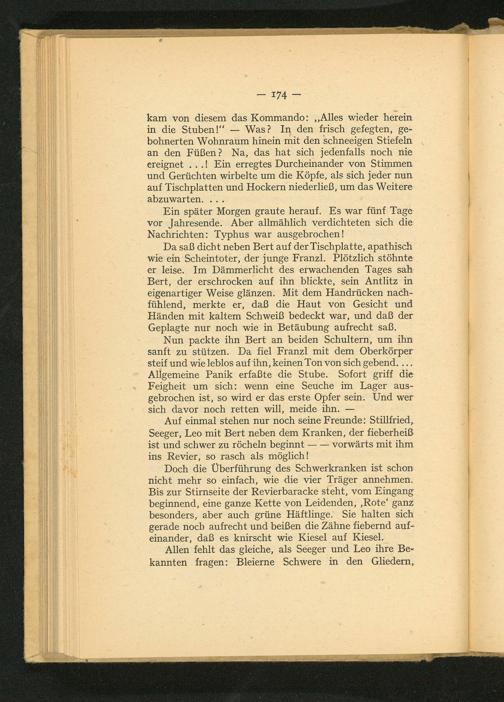 Nun packte ihn Bert an beiden Schultern, um ihn sanft zu stützen. Da fiel Franzl mit dem Oberkörper steif und wie leblos auf ihn, keinen Ton von sich gebend.... Allgemeine Panik erfaßte die Stube. Sofort griff die Feigheit um sich: wenn eine Seuche im Lager ausgebrochen ist, so wird er das erste Opfer sein. Und wer sich davor noch retten will, meide ihn.