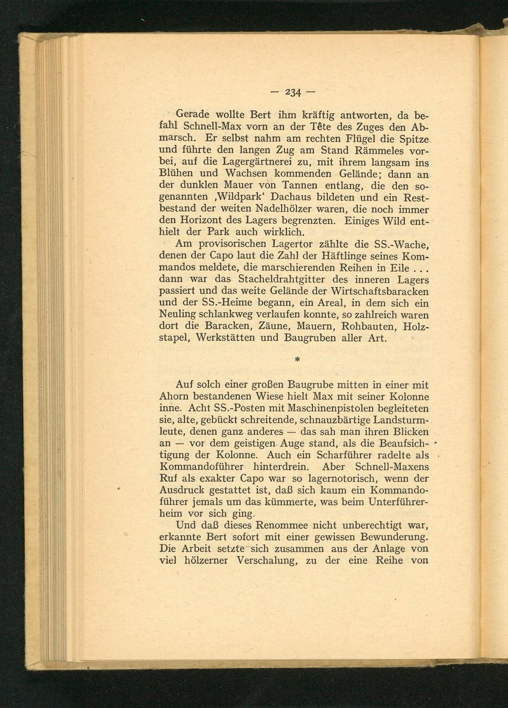 Am provisorischen Lagertor zählte die SS.-Wache, denen der Capo laut die Zahl der Häftlinge seines Kom- mandos meldete, die marschierenden Reihen in Eile... dann war das Stacheldrahtgitter des inneren Lagers passiert und das weite Gelände der Wirtschaftsbaracken und der SS. -Heime begann, ein Areal, in dem sich ein Neuling schlankweg verlaufen konnte, so zahlreich waren dort die Baracken, Zäune, Mauern, Rohbauten, Holz- stapel, Werkstätten und Baugruben aller Art.