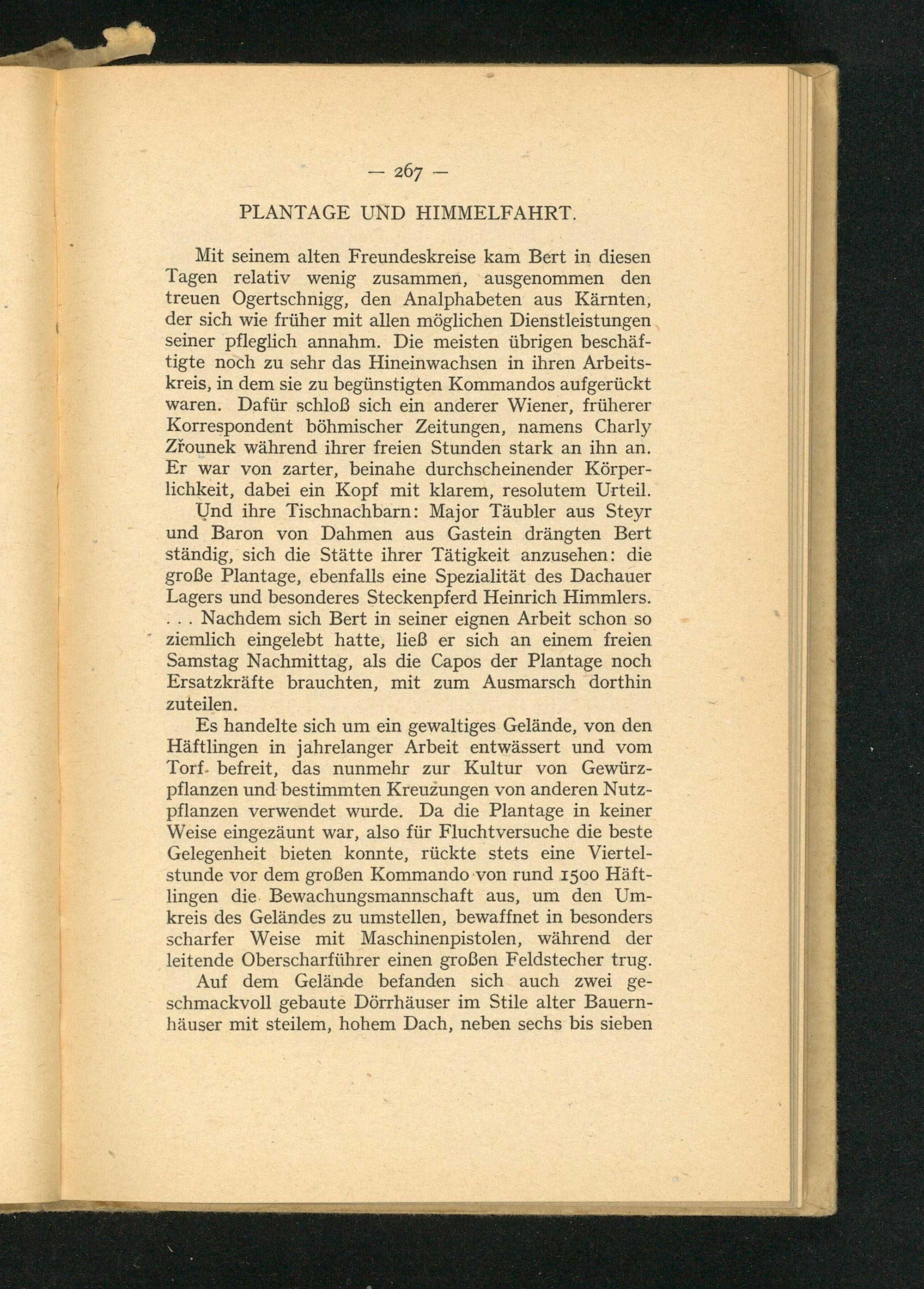 Und ihre Tischnachbarn: Major Täubler aus Steyr und Baron von Dahmen aus Gastein drängten Bert ständig, sich die Stätte ihrer Tätigkeit anzusehen: die große Plantage, ebenfalls eine Spezialität des Dachauer Lagers und besonderes Steckenpferd Heinrich Himmlers . .... Nachdem sich Bert in seiner eignen Arbeit schon so