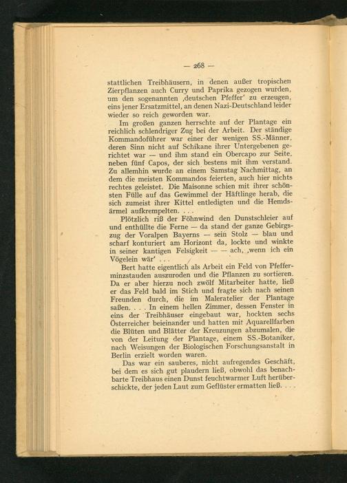 Bert hatte eigentlich als Arbeit ein Feld von Pfefferminzstauden auszuroden und die Pflanzen zu sortieren. Da er aber hierzu noch zwölf Mitarbeiter hatte, ließ er das Feld bald im Stich und fragte sich nach seinen Freunden durch, die im Maleratelier der Plantage saßen.... In einem hellen Zimmer, dessen Fenster in eins der Treibhäuser eingebaut war, hockten sechs Österreicher beieinander und hatten mit Aquarellfarben die Blüten und Blätter der Kreuzungen abzumalen, die von der Leitung der Plantage, einem SS.- Botaniker, nach Weisungen der Biologischen Forschungsanstalt in Berlin erzielt worden waren.