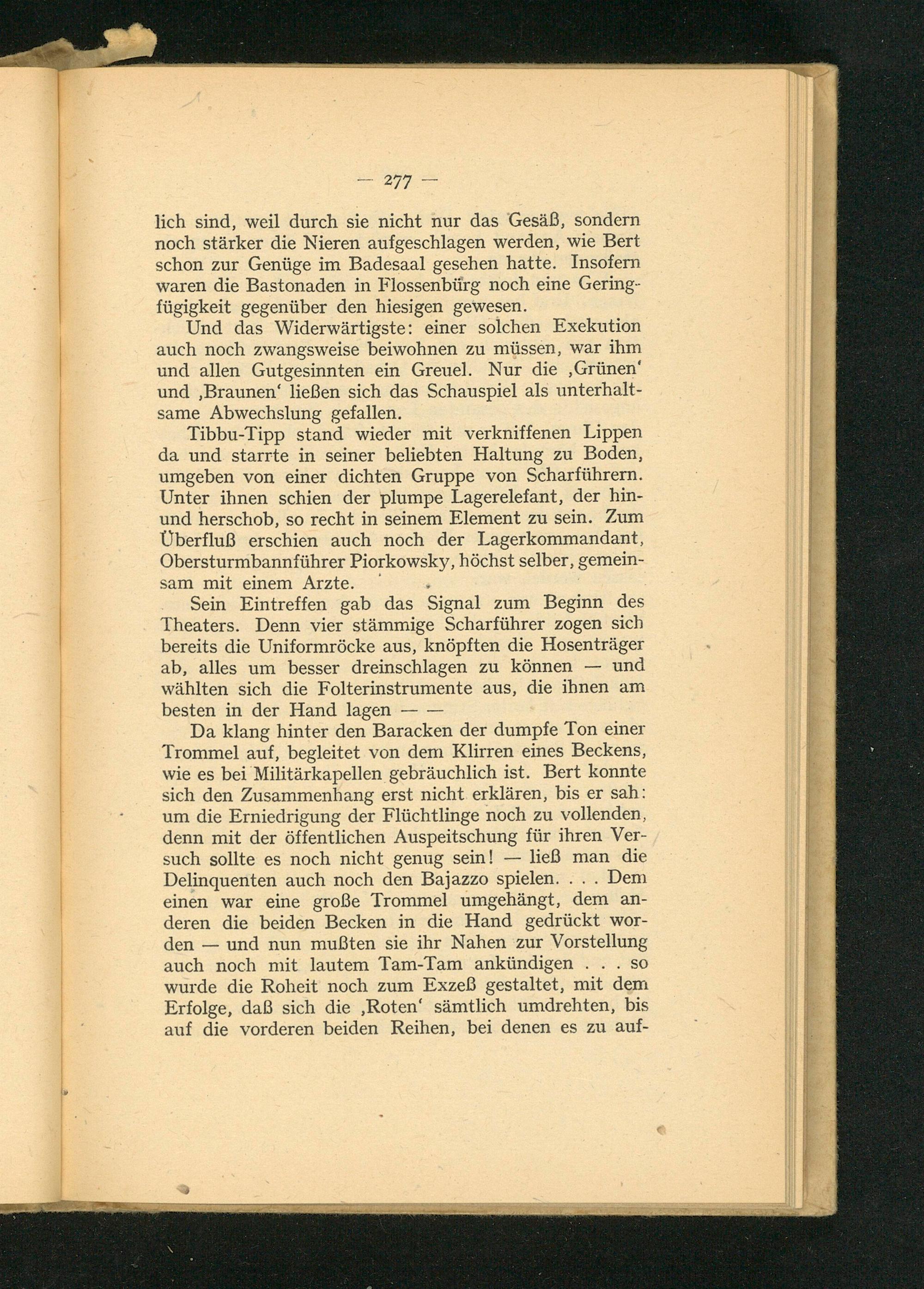 Tibbu-Tipp stand wieder mit verkniffenen Lippen da und starrte in seiner beliebten Haltung zu Boden, umgeben von einer dichten Gruppe von Scharführern. Unter ihnen schien der plumpe Lagerelefant, der hin- und herschob, so recht in seinem Element zu sein. Zum Überfluß erschien auch noch der Lagerkommandant, Obersturmbannführer Piorkowsky, höchst selber, gemein- sam mit einem Arzte.;