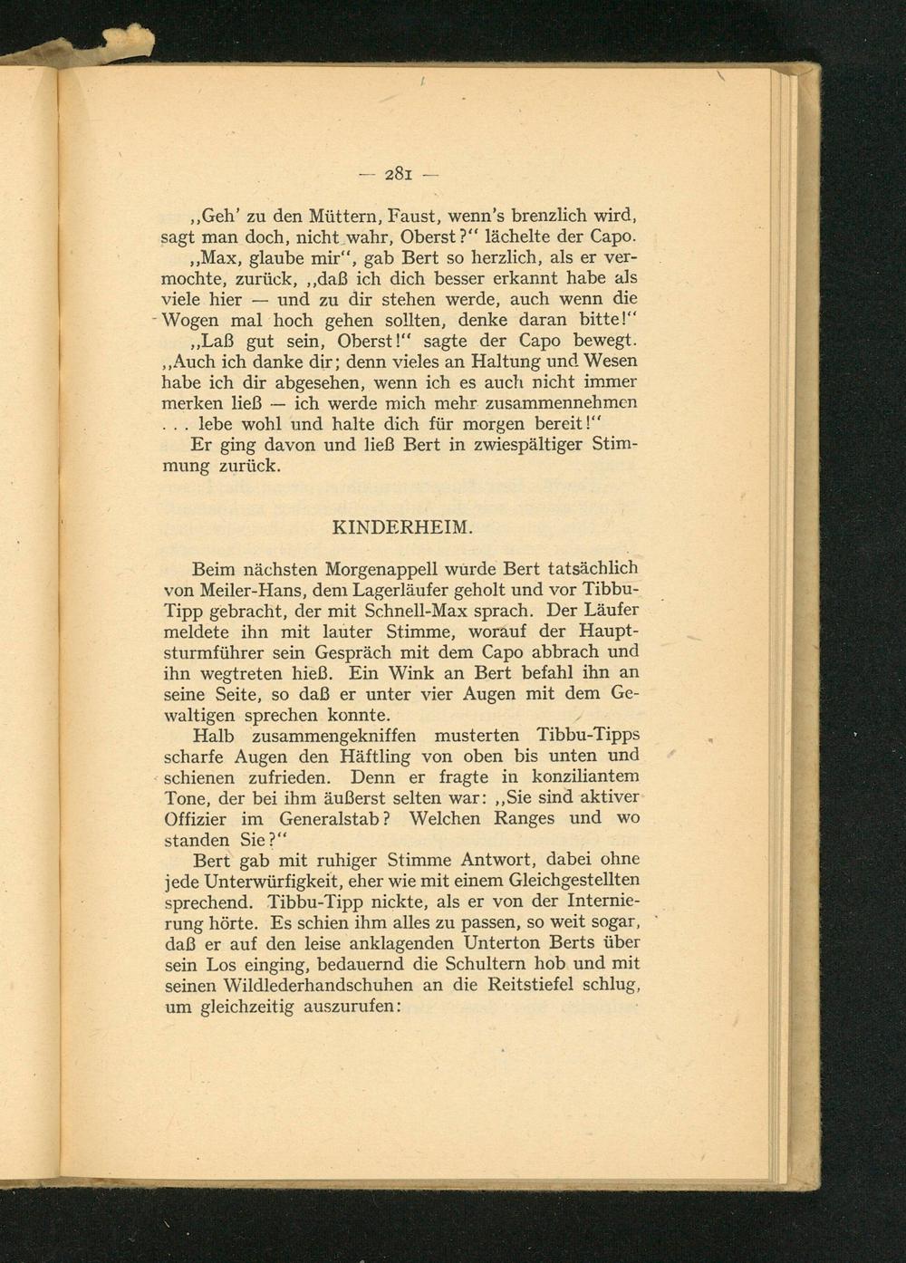 ,, Geh' zu den Müttern, Faust, wenn's brenzlich wird, sagt man doch, nicht wahr, Oberst?" lächelte der Capo. ,, Max, glaube mir", gab Bert so herzlich, als er vermochte, zurück ,,, daß ich dich besser erkannt habe als viele hier und zu dir stehen werde, auch wenn die Wogen mal hoch gehen sollten, denke daran bitte!" ,, Laẞ gut sein, Oberst!" sagte der Capo bewegt. ,, Auch ich danke dir; denn vieles an Haltung und Wesen habe ich dir abgesehen, wenn ich es auch nicht immer merken ließ ich werde mich mehr zusammennehmen lebe wohl und halte dich für morgen bereit!" Er ging davon und ließ Bert in zwiespältiger Stimmung zurück.