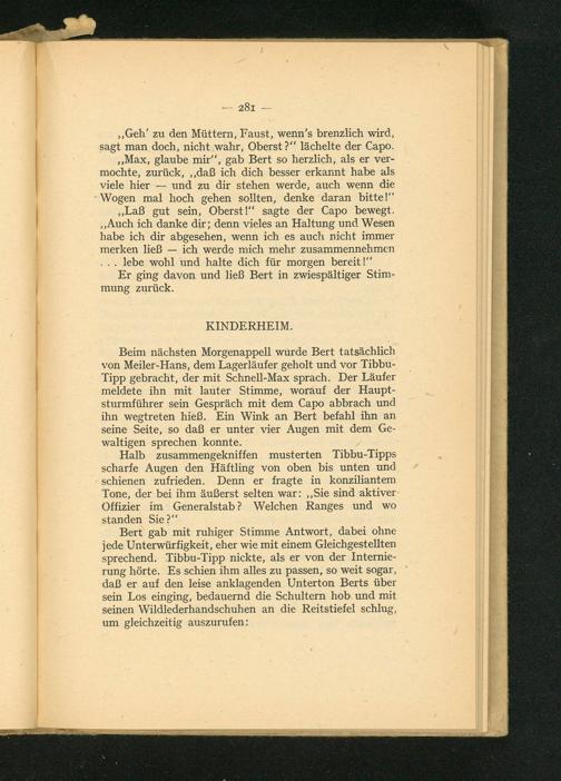 Halb zusammengekniffen musterten Tibbu- Tipps scharfe Augen den Häftling von oben bis unten und schienen zufrieden. Denn er fragte in konziliantem Tone, der bei ihm äußerst selten war: ,, Sie sind aktiver Offizier im Generalstab? Welchen Ranges und wo standen Sie?"