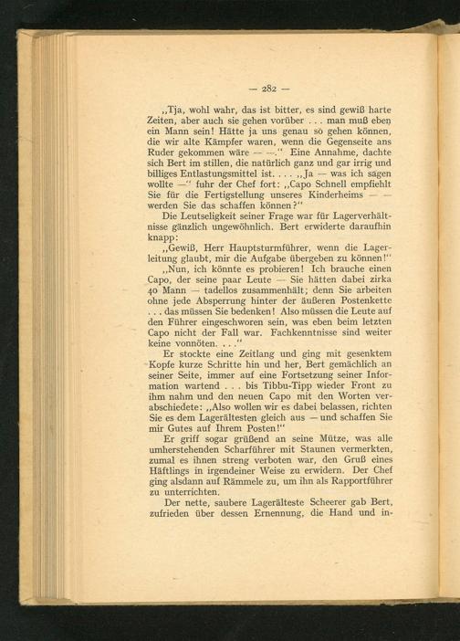 Er stockte eine Zeitlang und ging mit gesenktem Kopfe kurze Schritte hin und her, Bert gemächlich an seiner Seite, immer auf eine Fortsetzung seiner Information wartend.. bis Tibbu- Tipp wieder Front zu ihm nahm und den neuen Capo mit den Worten verabschiedete: ,, Also wollen wir es dabei belassen, richten Sie es dem Lagerältesten gleich aus und schaffen Sie mir Gutes auf Ihrem Posten!"