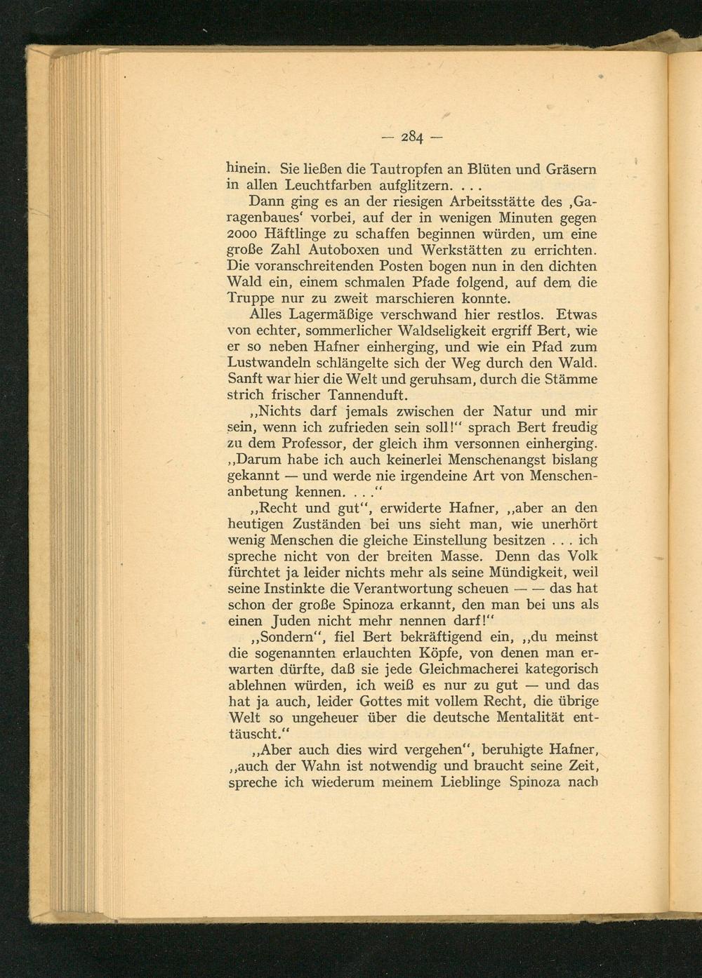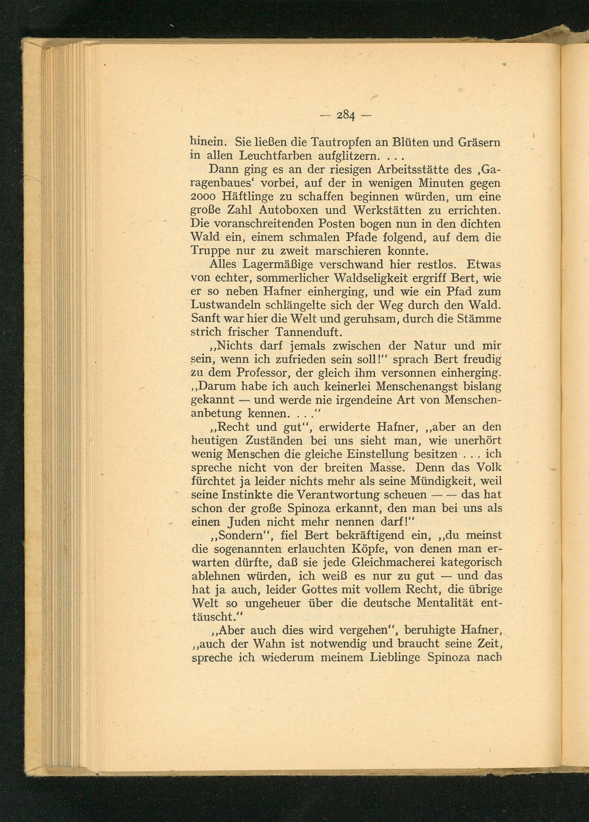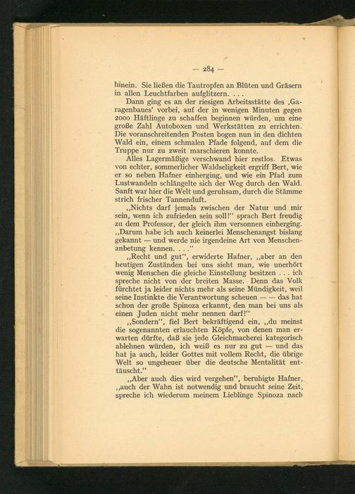 ,, Recht und gut", erwiderte Hafner ,,, aber an den heutigen Zuständen bei uns sieht man, wie unerhört wenig Menschen die gleiche Einstellung besitzen... ich spreche nicht von der breiten Masse. Denn das Volk fürchtet ja leider nichts mehr als seine Mündigkeit, weil seine Instinkte die Verantwortung scheuen das hat schon der große Spinoza erkannt, den man bei uns als einen Juden nicht mehr nennen darf!"