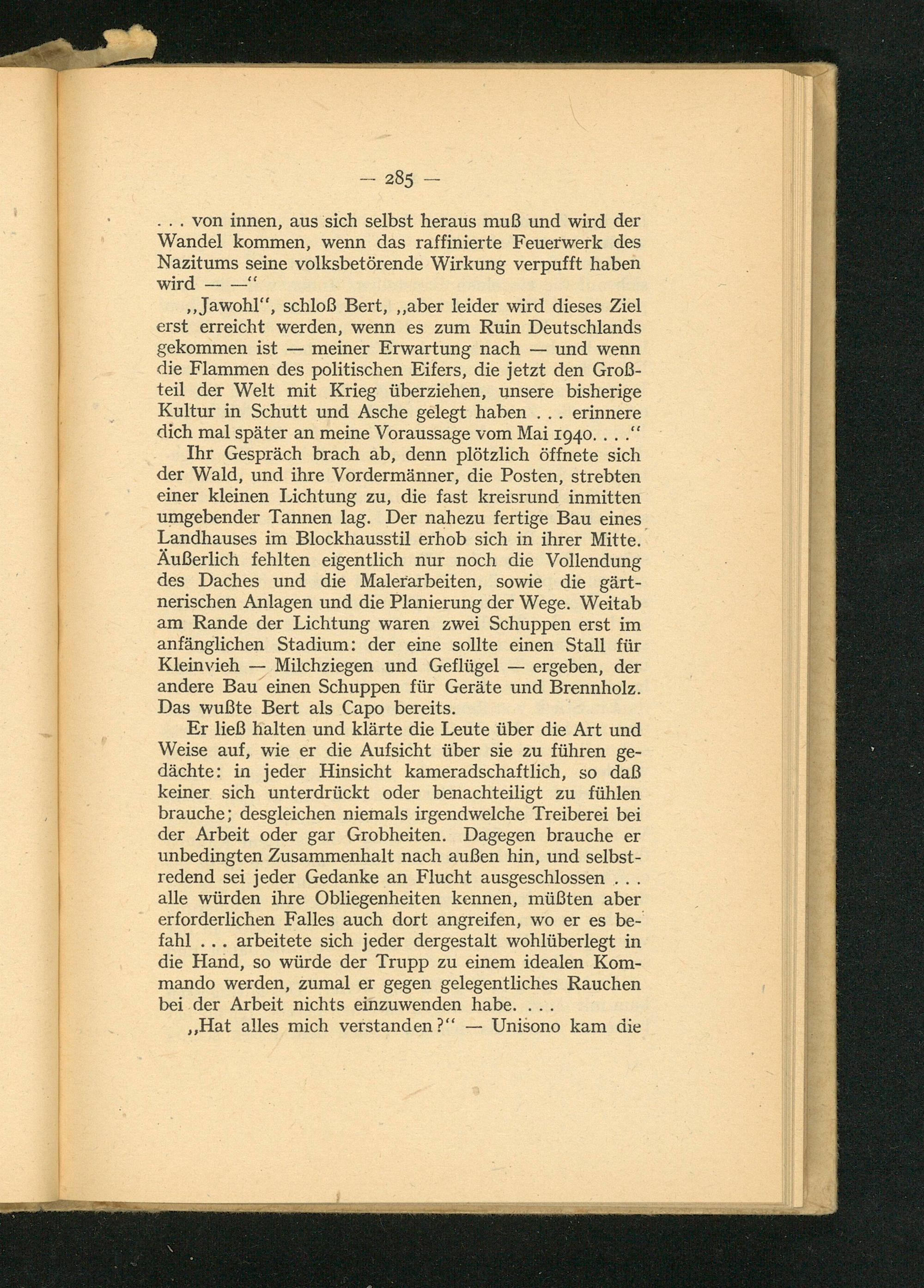 „Jawohl‘, schloß Bert, ‚‚aber leider wird dieses Ziel erst erreicht werden, wenn es zum Ruin Deutschlands gekommen ist— meiner Erwartung nach— und wenn die Flammen des politischen Eifers, die jetzt den Groß- teil der Welt mit Krieg überziehen, unsere bisherige Kultur in Schutt und Asche gelegt haben... erinnere dich mal später an meine Voraussage vom Mai 1940....“