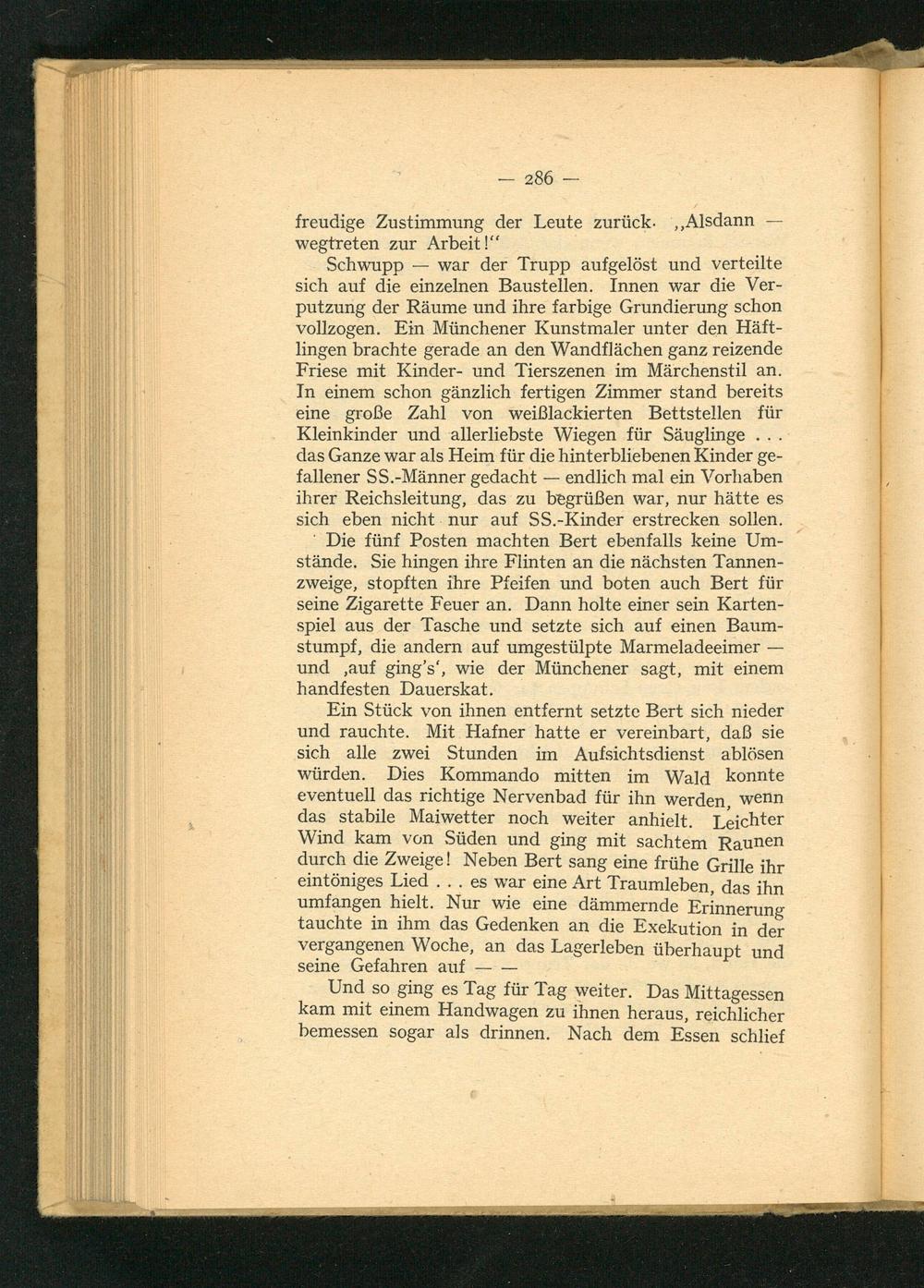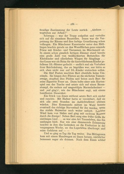Schwupp war der Trupp aufgelöst und verteilte sich auf die einzelnen Baustellen. Innen war die Verputzung der Räume und ihre farbige Grundierung schon vollzogen. Ein Münchener Kunstmaler unter den Häftlingen brachte gerade an den Wandflächen ganz reizende Friese mit Kinder- und Tierszenen im Märchenstil an. In einem schon gänzlich fertigen Zimmer stand bereits eine große Zahl von weißlackierten Bettstellen für Kleinkinder und allerliebste Wiegen für Säuglinge das Ganze war als Heim für die hinterbliebenen Kinder gefallener SS.- Männer gedacht- endlich mal ein Vorhaben ihrer Reichsleitung, das zu begrüßen war, nur hätte es sich eben nicht nur auf SS.- Kinder erstrecken sollen.