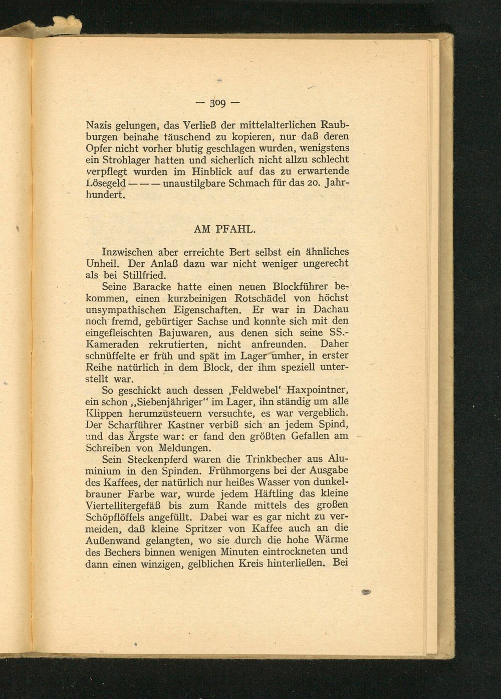 Seine Baracke hatte einen neuen Blockführer bekommen, einen kurzbeinigen Rotschädel von höchst unsympathischen Eigenschaften. Er war in Dachau noch fremd, gebürtiger Sachse und konnte sich mit den eingefleischten Bajuwaren, aus denen sich seine SS.Kameraden rekrutierten, nicht anfreunden. Daher schnüffelte er früh und spät im Lager umher, in erster Reihe natürlich in dem Block, der ihm speziell unterstellt war.