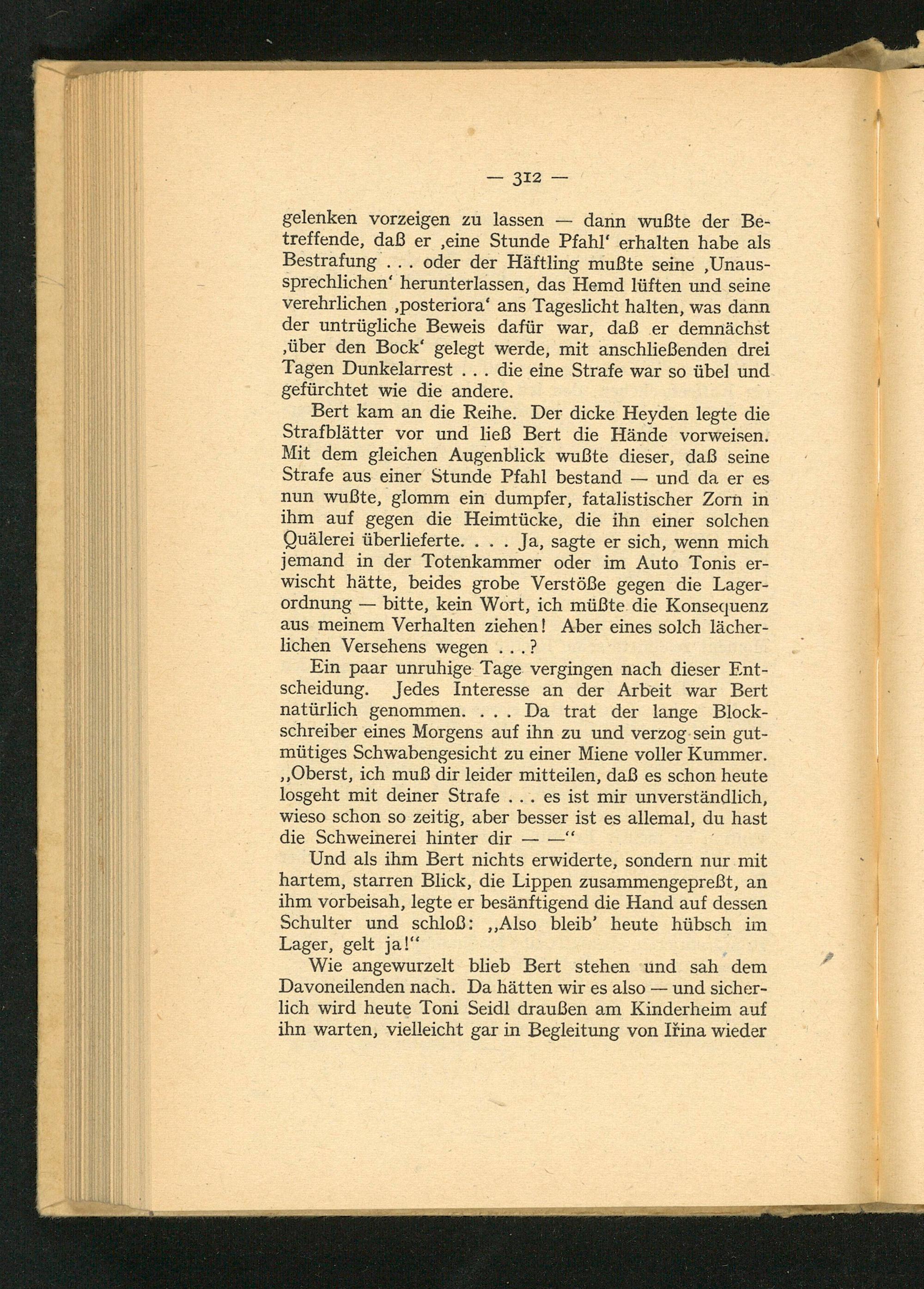 Bert kam an die Reihe. Der dicke Heyden legte die Strafblätter vor und ließ Bert die Hände vorweisen. Mit dem gleichen Augenblick wußte dieser, daß seine Strafe aus einer Stunde Pfahl bestand und da er es nun wußte, glomm ein dumpfer, fatalistischer Zorn in ihm auf gegen die Heimtücke, die ihn einer solchen Quälerei überlieferte.... Ja, sagte er sich, wenn mich jemand in der Totenkammer oder im Auto Tonis erwischt hätte, beides grobe Verstöße gegen die Lagerordnung bitte, kein Wort, ich müßte die Konsequenz aus meinem Verhalten ziehen! Aber eines solch lächerlichen Versehens wegen...?