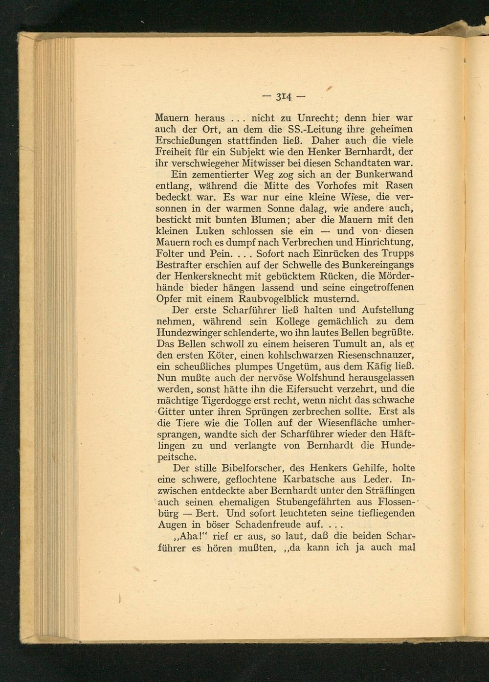 Ein zementierter Weg zog sich an der Bunkerwand entlang, während die Mitte des Vorhofes mit Rasen bedeckt war. Es war nur eine kleine Wiese, die versonnen in der warmen Sonne dalag, wie andere auch, bestickt mit bunten Blumen; aber die Mauern mit den kleinen Luken schlossen sie ein und von diesen Mauern roch es dumpf nach Verbrechen und Hinrichtung, Folter und Pein.... Sofort nach Einrücken des Trupps Bestrafter erschien auf der Schwelle des Bunkereingangs der Henkersknecht mit gebücktem Rücken, die Mörderhände bieder hängen lassend und seine eingetroffenen Opfer mit einem Raubvogelblick musternd.