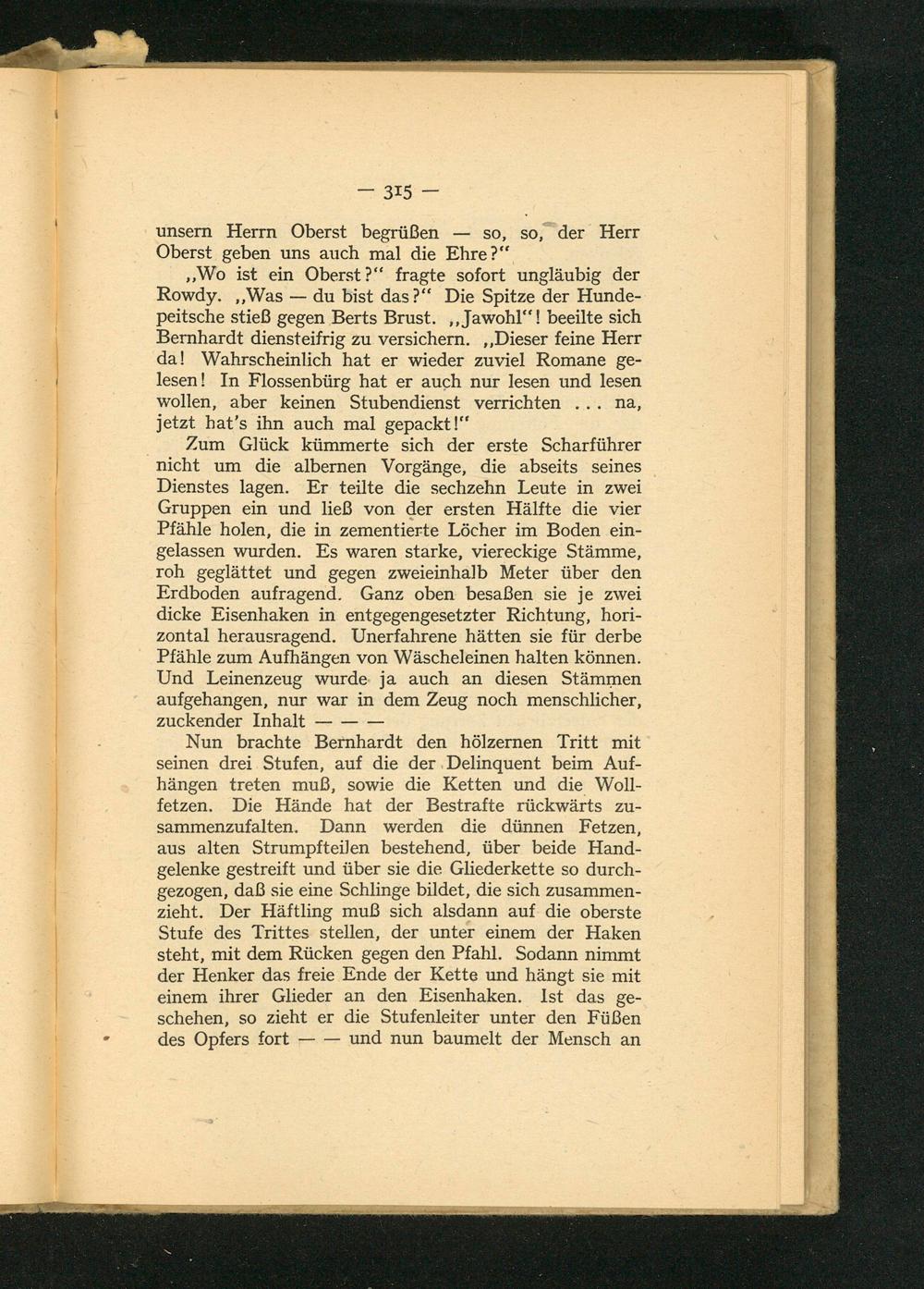 Nun brachte Bernhardt den hölzernen Tritt mit seinen drei Stufen, auf die der Delinquent beim Aufhängen treten muß, sowie die Ketten und die Wollfetzen. Die Hände hat der Bestrafte rückwärts zusammenzufalten. Dann werden die dünnen Fetzen, aus alten Strumpfteilen bestehend, über beide Handgelenke gestreift und über sie die Gliederkette so durchgezogen, daß sie eine Schlinge bildet, die sich zusammenzieht. Der Häftling muß sich alsdann auf die oberste Stufe des Trittes stellen, der unter einem der Haken steht, mit dem Rücken gegen den Pfahl. Sodann nimmt der Henker das freie Ende der Kette und hängt sie mit einem ihrer Glieder an den Eisenhaken. Ist das geschehen, so zieht er die Stufenleiter unter den Füßen des Opfers fort- und nun baumelt der Mensch an