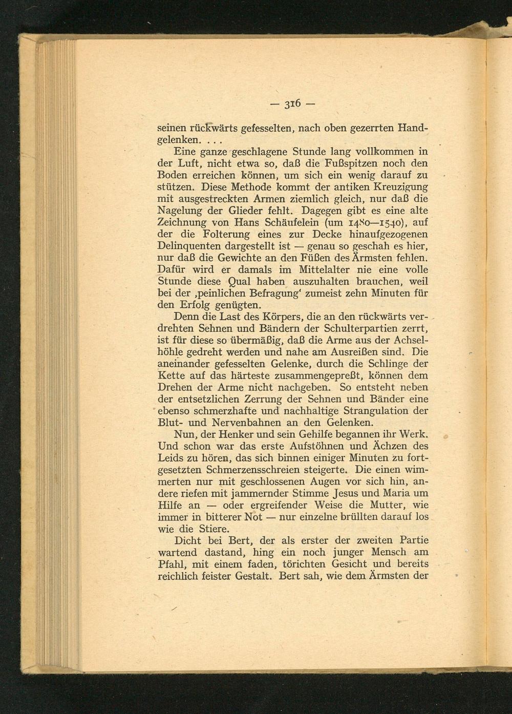Eine ganze geschlagene Stunde lang vollkommen in der Luft, nicht etwa so, daß die Fußspitzen noch den Boden erreichen können, um sich ein wenig darauf zu stützen. Diese Methode kommt der antiken Kreuzigung mit ausgestreckten Armen ziemlich gleich, nur daß die Nagelung der Glieder fehlt. Dagegen gibt es eine alte Zeichnung von Hans Schäufelein ( um 1480-1540), auf der die Folterung eines zur Decke hinaufgezogenen Delinquenten dargestellt ist genau so geschah es hier, nur daß die Gewichte an den Füßen des Ärmsten fehlen. Dafür wird er damals im Mittelalter nie eine volle Stunde diese Qual haben auszuhalten brauchen, weil bei der, peinlichen Befragung' zumeist zehn Minuten für den Erfolg genügten.