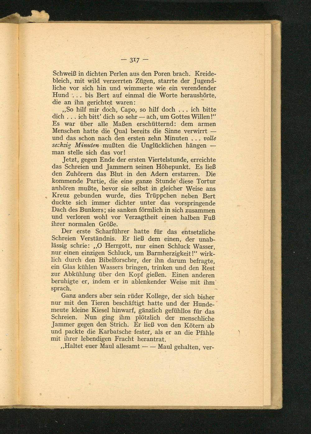 Der erste Scharführer hatte für das entsetzliche Schreien Verständnis. Er ließ dem einen, der unab- lässig schrie: ‚‚O Herrgott, nur einen Schluck Wasser, nur einen einzigen Schluck, um Barmherzigkeit!“ wirk- lich durch den Bibelforscher, der ihn darum befragte, ein Glas kühlen Wassers bringen, trinken und den Rest zur Abkühlung über den Kopf gießen. Einen anderen beruhigte er, indem er in ablenkender Weise mit ihm’