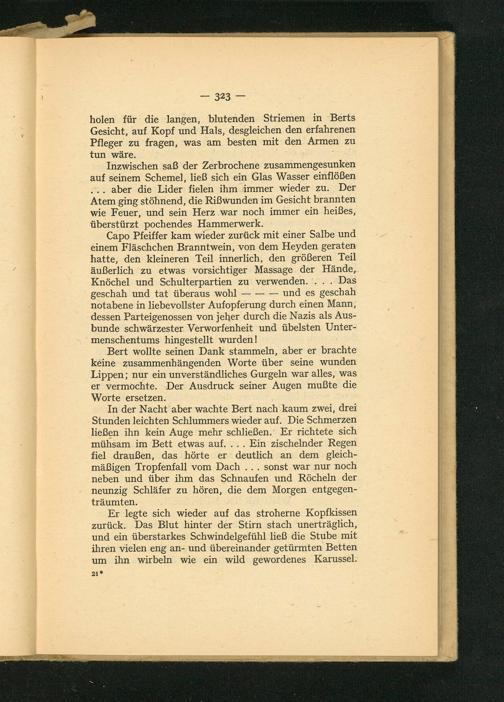 Capo Pfeiffer kam wieder zurück mit einer Salbe und einem Fläschchen Branntwein, von dem Heyden geraten hatte, den kleineren Teil innerlich, den größeren Teil äußerlich zu etwas vorsichtiger Massage der Hände, Knöchel und Schulterpartien zu verwenden.... Das geschah und tat überaus wohl——— und es geschah notabene in liebevollster Aufopferung durch einen Mann, dessen Parteigenossen von jeher durch die Nazis als Aus- bunde schwärzester Verworfenheit und übelsten Unter- menschentums hingestellt wurden!