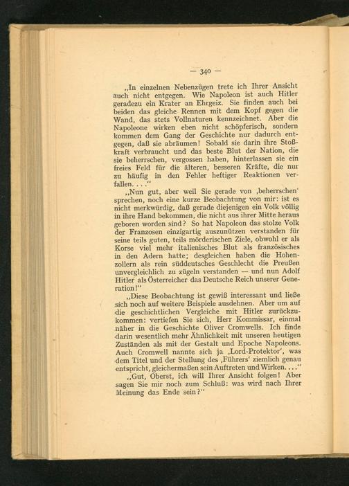 „Diese Beobachtung ist gewiß interessant und ließe sich noch auf weitere Beispiele ausdehnen. Aber um auf die geschichtlichen Vergleiche mit Hitler zurückzu- kommen: vertiefen Sie sich, Herr Kommissar, einmal näher in die Geschichte Oliver Cromwells. Ich finde ‚darin wesentlich mehr Ähnlichkeit mit unseren heutigen Zuständen als mit der Gestalt und Epoche Napoleons . Auch Cromwell nannte sich ja ‚Lord-Protektor‘, was .dem Titel und der Stellung des ‚Führers‘ ziemlich genau entspricht, gleichermaßen sein Auftreten und Wirken....“