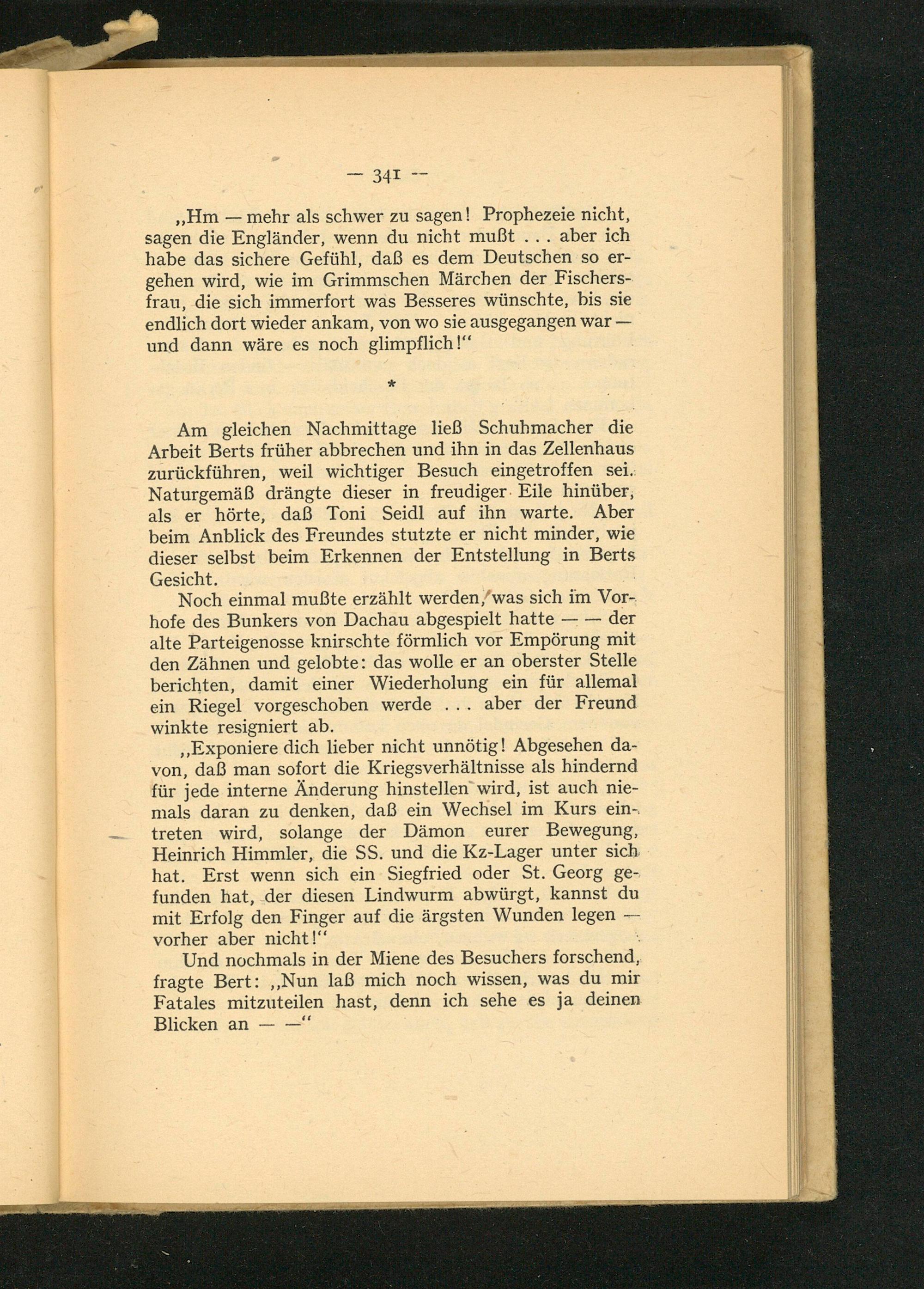Noch einmal mußte erzählt werden, was sich im Vor­hofe des Bunkers von Dachau abgespielt hatte- der alte Parteigenosse knirschte förmlich vor Empörung mit den Zähnen und gelobte: das wolle er an oberster Stelle berichten, damit einer Wiederholung ein für allemal ein Riegel vorgeschoben werde... aber der Freund winkte resigniert ab.