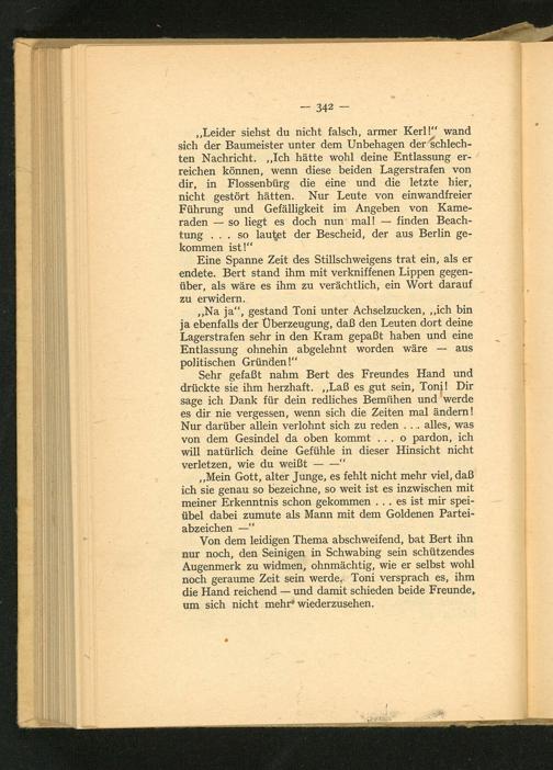 ,, Na ja", gestand Toni unter Achselzucken ,,, ich bin ja ebenfalls der Überzeugung, daß den Leuten dort deine Lagerstrafen sehr in den Kram gepaßt haben und eine Entlassung ohnehin abgelehnt worden wäre politischen Gründen!"
