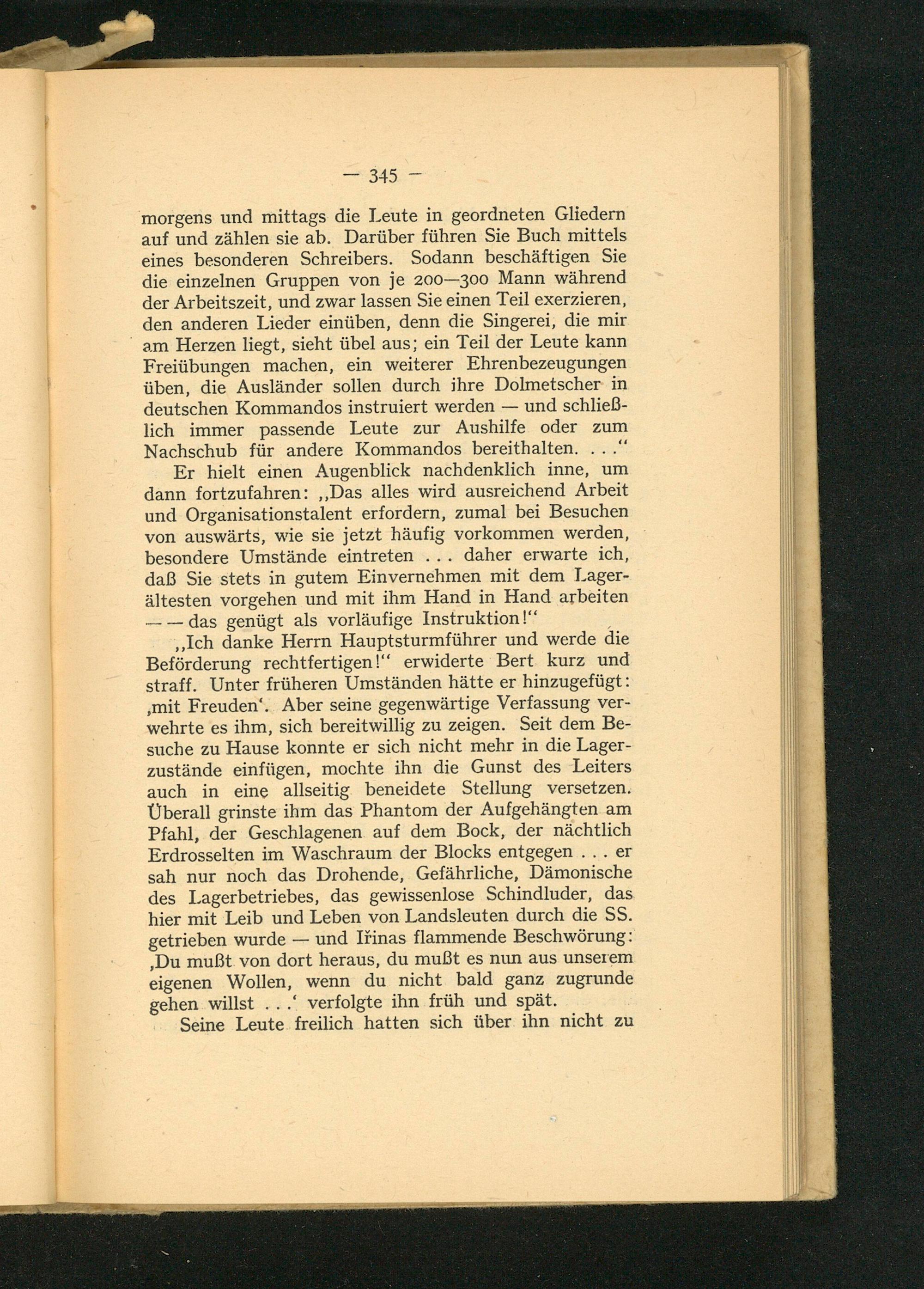 Er hielt einen Augenblick nachdenklich inne, um dann fortzufahren: ‚Das alles wird ausreichend Arbeit und Organisationstalent erfordern, zumal bei Besuchen von auswärts, wie sie jetzt häufig vorkommen werden, besondere Umstände eintreten... daher erwarte ich, daß Sie stets in gutem Einvernehmen mit dem Lager- ältesten vorgehen und mit ihm Hand in Hand arbeiten —— das genügt als vorläufige Instruktion!“