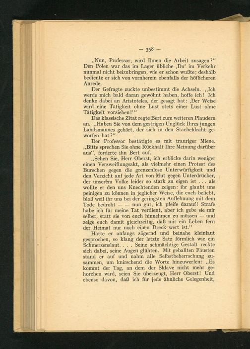 ,, Nun, Professor, wird Ihnen die Arbeit zusagen?" Den Polen war das im Lager übliche, Du' im Verkehr nunmal nicht beizubringen, wie er schon wußte; deshalb bediente er sich von vornherein ebenfalls der höflicheren Anrede.