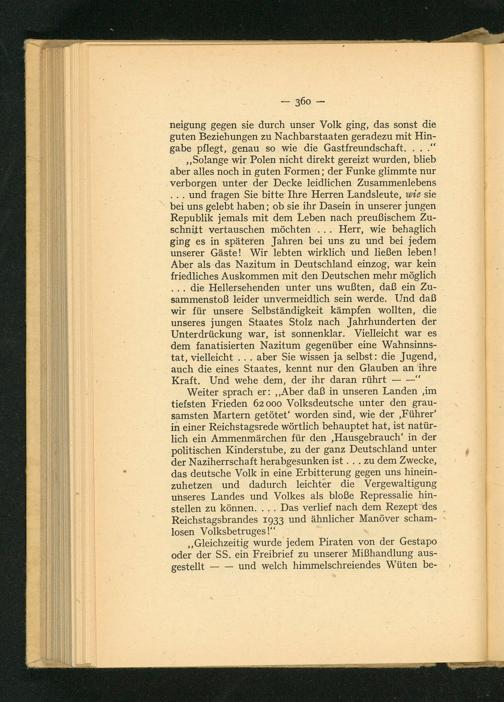 „Solange wir Polen nicht direkt gereizt wurden, blieb aber alles noch in guten Formen; der Funke glimmte nur verborgen unter der Decke leidlichen Zusammenlebens ... und fragen Sie bitte Ihre Herren Landsleute, wie sie bei uns gelebt haben; ob sie ihr Dasein in unserer jungen Republik jemals mit dem Leben nach preußischem Zu- schnitt vertauschen möchten... Herr, wie behaglich ging es in späteren Jahren bei uns zu und bei jedem unserer Gäste! Wir lebten wirklich und ließen leben! Aber als: das Nazitum in Deutschland einzog, war kein friedliches Auskommen mit den Deutschen mehr möglich ... die Hellersehenden unter uns wußten, daß ein Zu- sammenstoß leider unvermeidlich sein werde. Und daß wir für unsere Selbständigkeit kämpfen wollten, die unseres jungen Staates Stolz nach Jahrhunderten der Unterdrückung war, ist sonnenklar. Vielleicht war es dem fanatisierten Nazitum gegenüber eine Wahnsinns- tat, vielleicht... aber Sie wissen ja selbst: die Jugend, auch die eines Staates, kennt nur den Glauben an ihre Kraft. Und wehe dem, der ihr daran rührt——“
