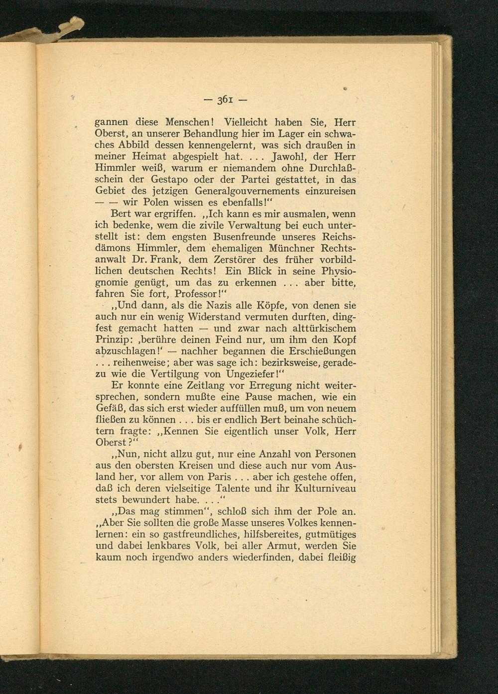 Bert war ergriffen. ,, Ich kann es mir ausmalen, wenn ich bedenke, wem die zivile Verwaltung bei euch unterstellt ist: dem engsten Busenfreunde unseres Reichsdämons Himmler, dem ehemaligen Münchner Rechtsanwalt Dr. Frank, dem Zerstörer des früher vorbildlichen deutschen Rechts! Ein Blick in seine Physiognomie genügt, um das zu erkennen.. aber bitte, fahren Sie fort, Professor!"