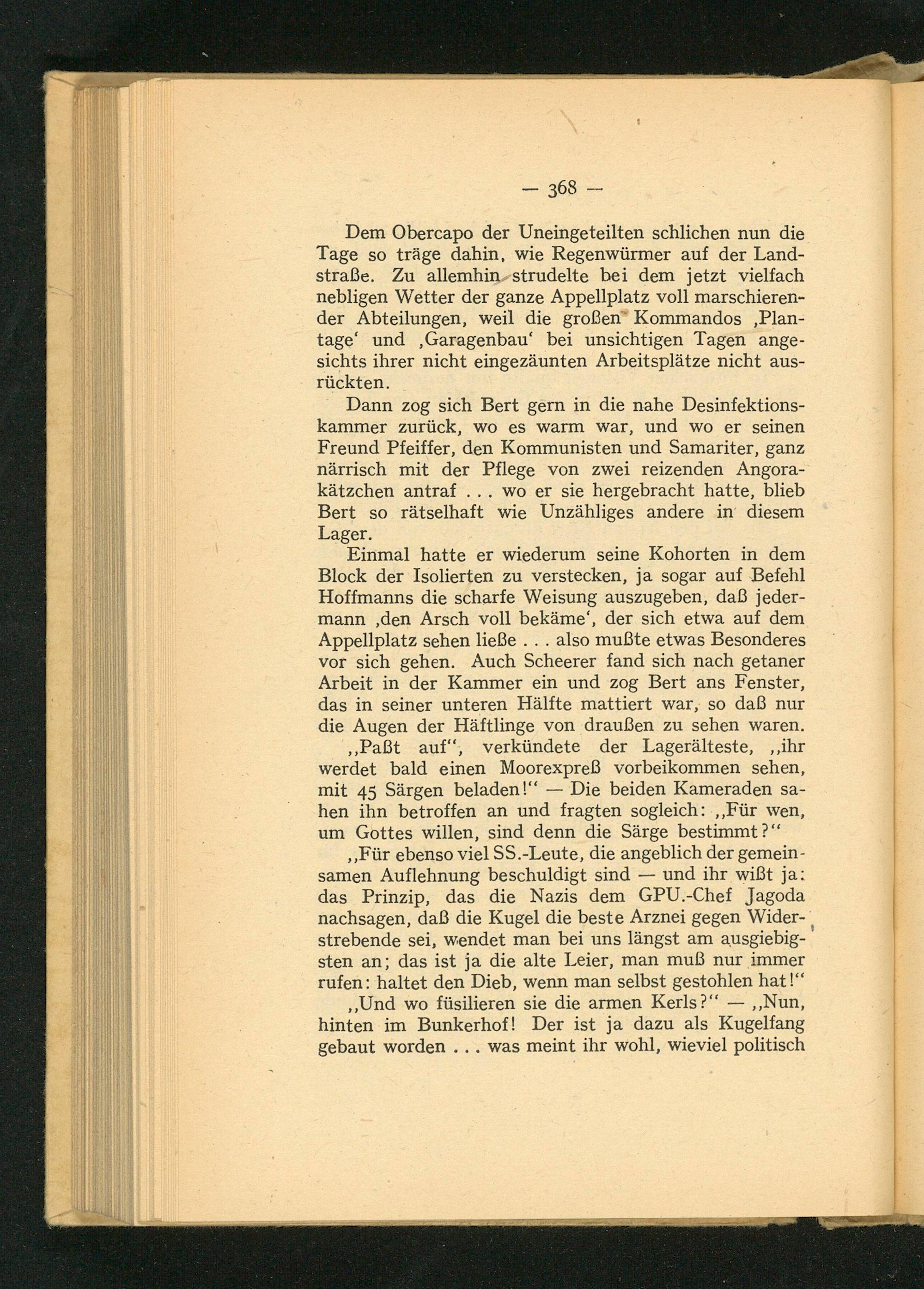 Dem Obercapo der Uneingeteilten schlichen nun die Tage so träge dahin, wie Regenwürmer auf der Landstraße. Zu allemhin strudelte bei dem jetzt vielfach nebligen Wetter der ganze Appellplatz voll marschierender Abteilungen, weil die großen Kommandos, Plantage und, Garagenbau' bei unsichtigen Tagen angesichts ihrer nicht eingezäunten Arbeitsplätze nicht ausrückten.