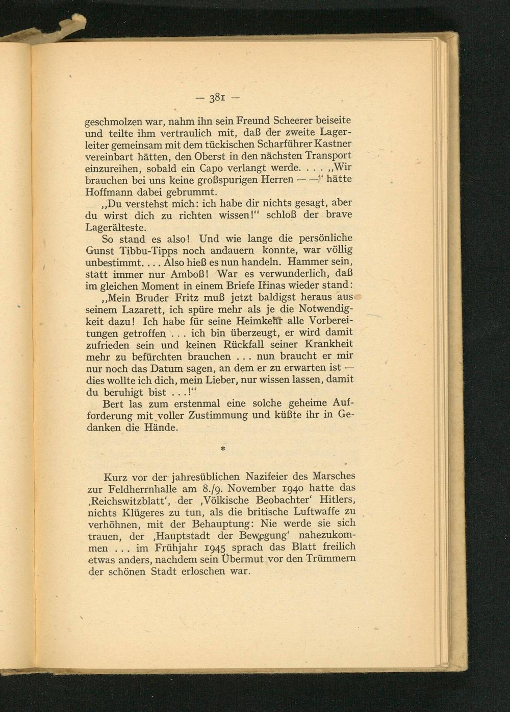 Kurz vor der jahresüblichen Nazifeier des Marsches zur Feldherrnhalle am 8./9. November 1940 hatte das , Reichswitzblatt', der Völkische Beobachter' Hitlers, nichts Klügeres zu tun, als die britische Luftwaffe zu verhöhnen, mit der Behauptung: Nie werde sie sich trauen, der, Hauptstadt der Bewegung' nahezukommen... im Frühjahr 1945 sprach das Blatt freilich etwas anders, nachdem sein Übermut vor den Trümmern der schönen Stadt erloschen war.