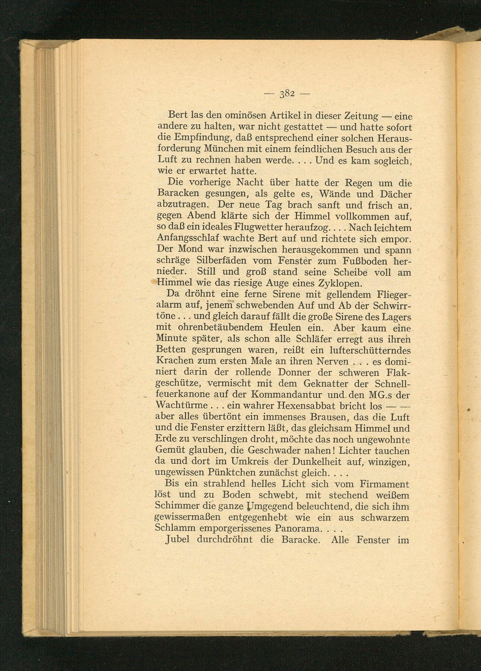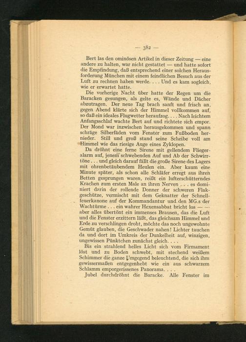 Bert las den ominösen Artikel in dieser Zeitung- eine andere zu halten, war nicht gestattet und hatte sofort die Empfindung, daß entsprechend einer solchen Herausforderung München mit einem feindlichen Besuch aus der Luft zu rechnen haben werde.... Und es kam sogleich, wie er erwartet hatte.
