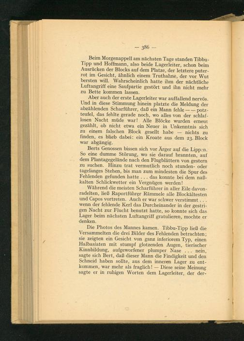 Beim Morgenappell am nächsten Tage standen Tibbu- Tipp und Hoffmann, also beide Lagerleiter, schon beim Ausrücken der Blocks auf dem Platze, der letztere puter- rot im Gesicht, ähnlich einem Truthahne, der vor Wut bersten will. Wahrscheinlich hatte ihm der nächtliche Luftangriff eine Saufpartie gestört und ihn nicht mehr zu Bette kommen lassen.