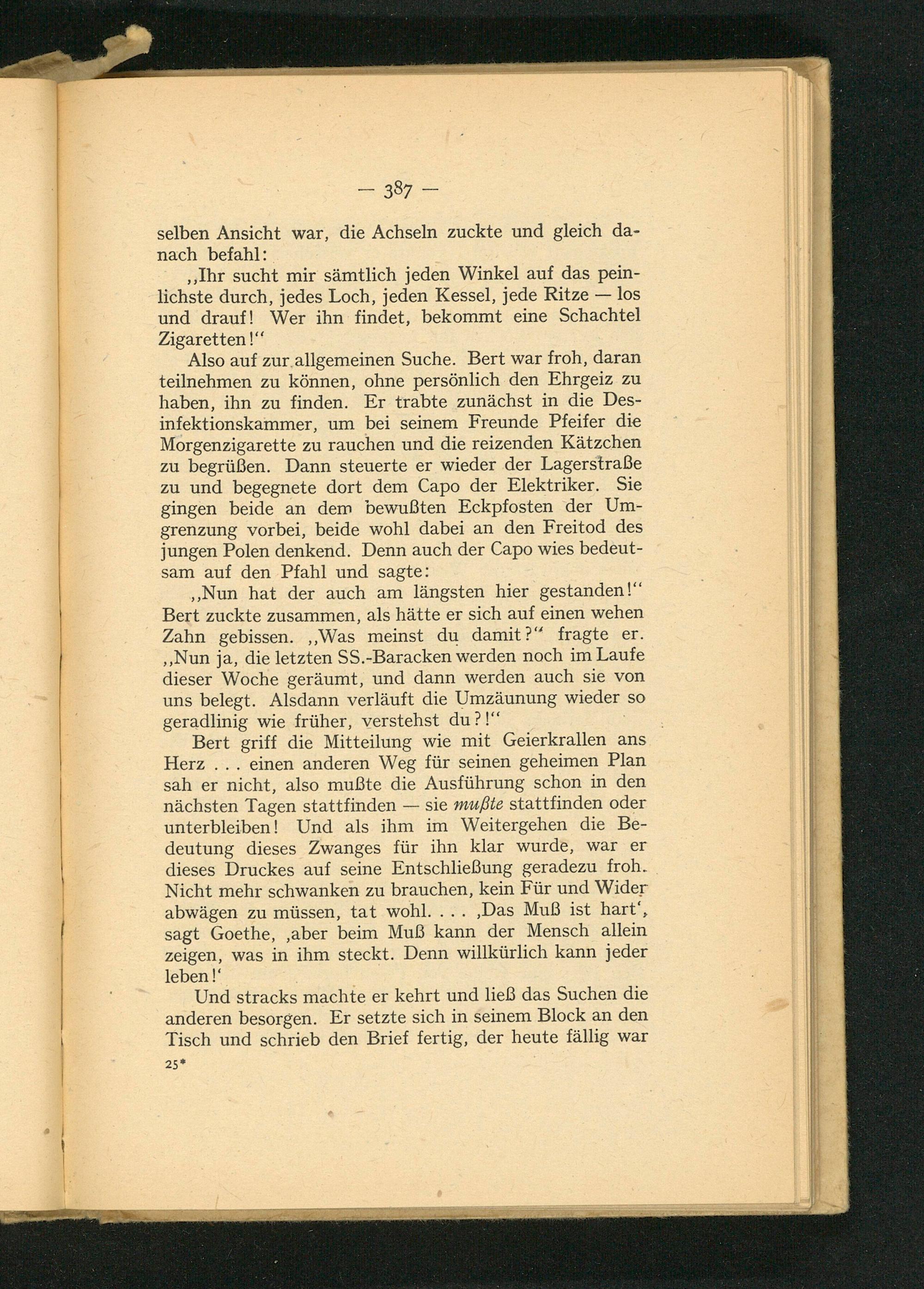 Also auf zur.allgemeinen Suche. Bert war froh, daran teilnehmen zu können, ohne persönlich den Ehrgeiz zu haben, ihn zu finden. Er trabte zunächst in die Des- infektionskammer, um bei seinem Freunde Pfeifer die Morgenzigarette zu rauchen und die reizenden Kätzchen zu begrüßen. Dann steuerte er wieder der Lagerstraße zu und begegnete dort dem Capo der Elektriker. Sie gingen beide an dem bewußten Eckpfosten der Um- grenzung vorbei, beide wohl dabei an den Freitod des jungen Polen denkend. Denn auch der Capo wies bedeut- sam auf den Pfahl und sagte: