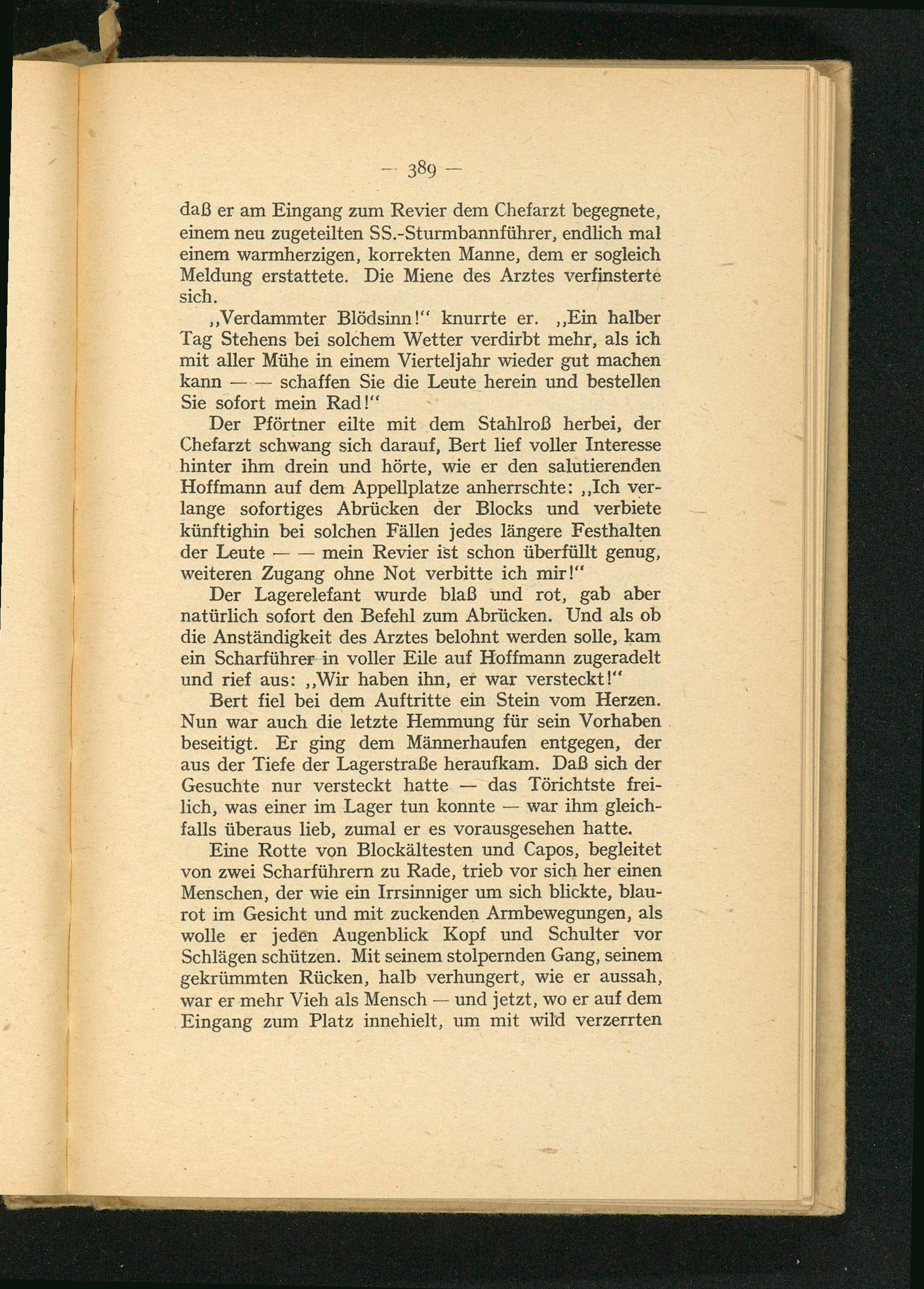 Der Lagerelefant wurde blaß und rot, gab aber natürlich sofort den Befehl zum Abrücken. Und als ob die Anständigkeit des Arztes belohnt werden solle, kam ein Scharführer in voller Eile auf Hoffmann zugeradelt und rief aus: Wir haben ihn, er war versteckt!"
