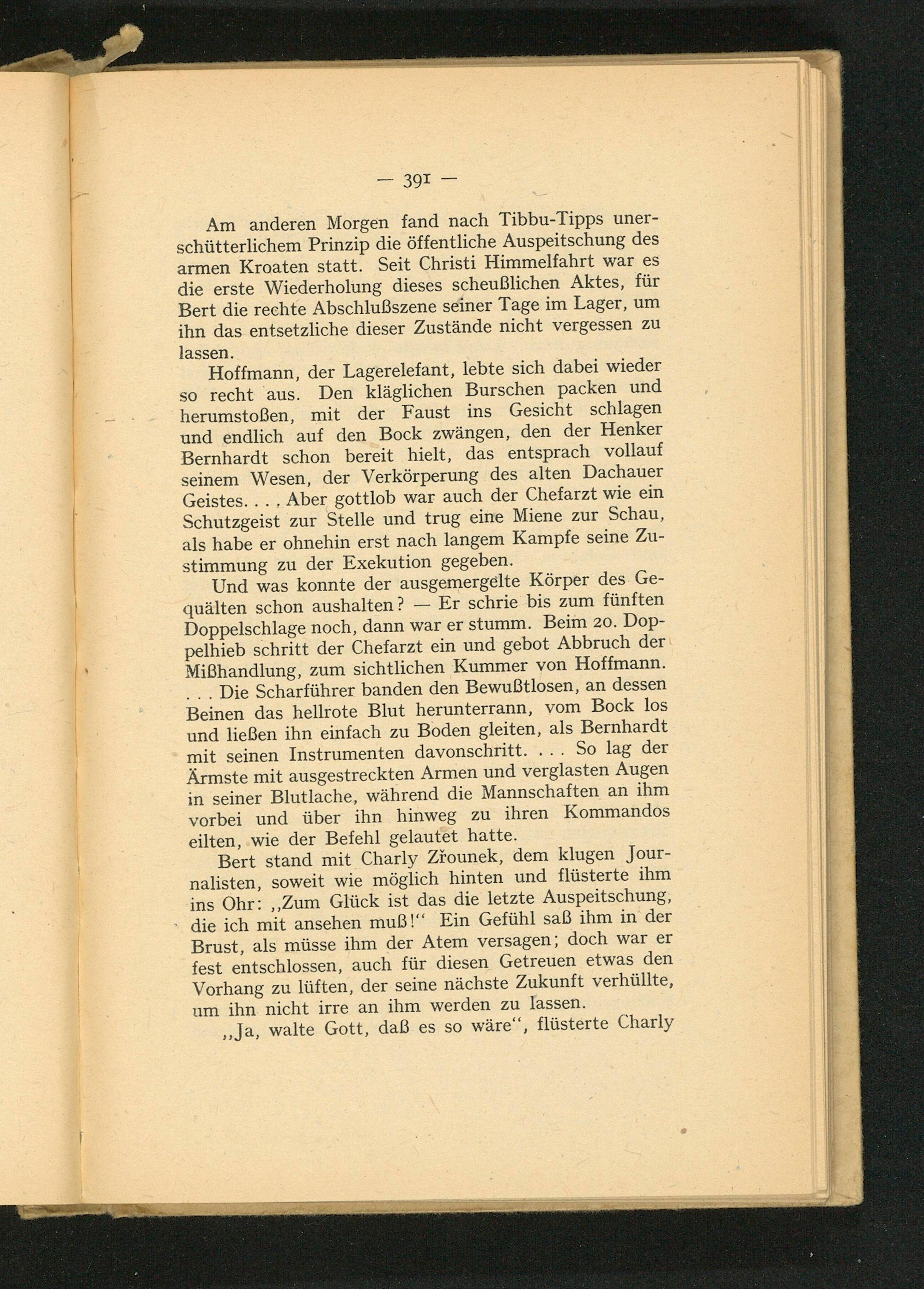 Hoffmann, der Lagerelefant, lebte sich dabei wieder so recht aus. Den kläglichen Burschen packen und herumstoßen, mit der Faust ins Gesicht schlagen und endlich auf den Bock zwängen, den der Henker Bernhardt schon bereit hielt, das entsprach vollauf seinem Wesen, der Verkörperung des alten Dachauer Geistes.... Aber gottlob war auch der Chefarzt wie ein Schutzgeist zur Stelle und trug eine Miene zur Schau, als habe er ohnehin erst nach langem Kampfe seine Zu- stimmung zu der Exekution gegeben.