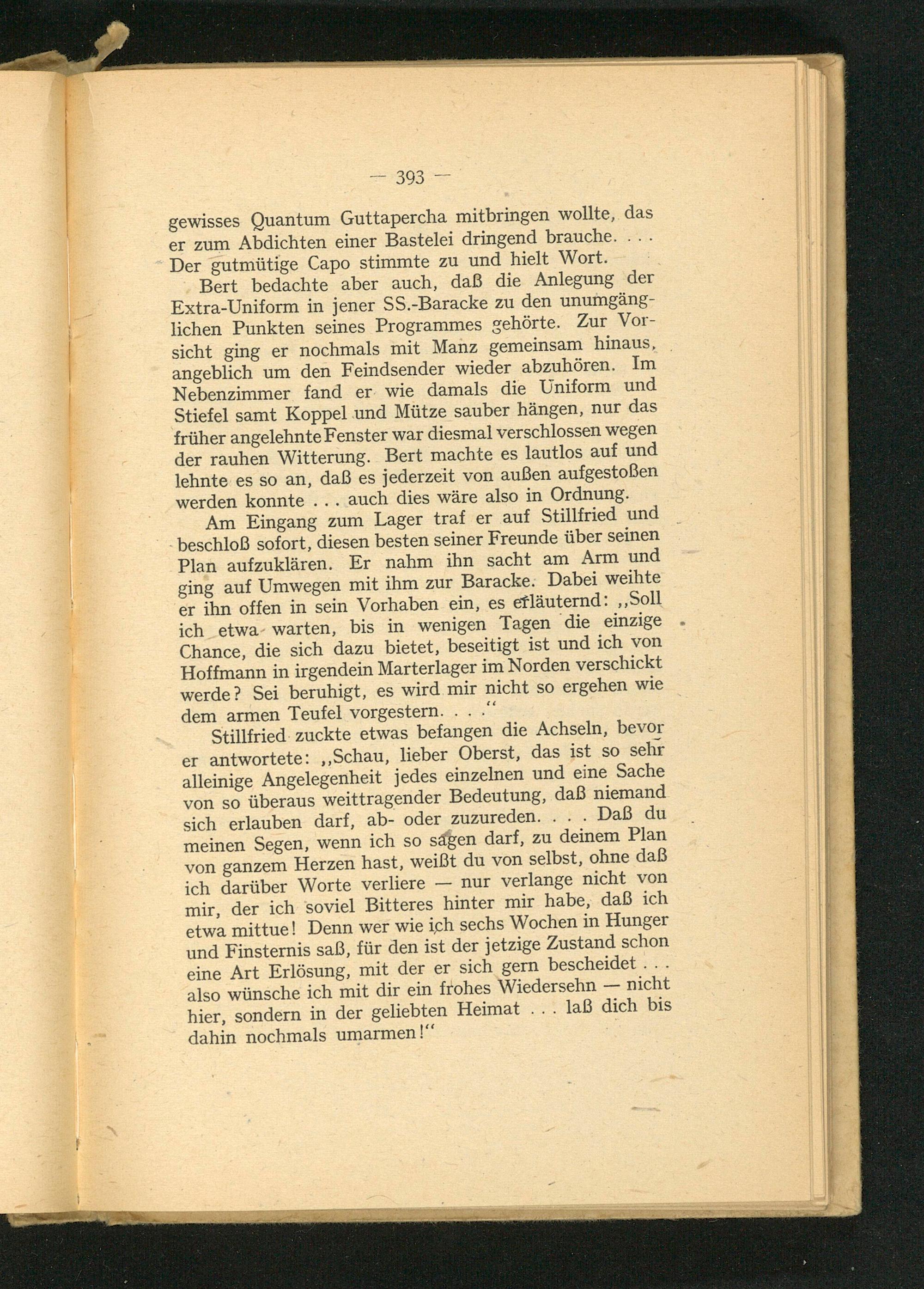Am Eingang zum Lager traf er auf Stillfried und beschloß sofort, diesen besten seiner Freunde über seinen Plan aufzuklären. Er nahm ihn sacht am Arm und ging auf Umwegen mit ihm zur Baracke. Dabei weihte er ihn offen in sein Vorhaben ein, es erläuternd: ,, Soll ich etwa warten, bis in wenigen Tagen die einzige Chance, die sich dazu bietet, beseitigt ist und ich von Hoffmann in irgendein Marterlager im Norden verschickt werde? Sei beruhigt, es wird mir nicht so ergehen wie dem armen Teufel vorgestern.