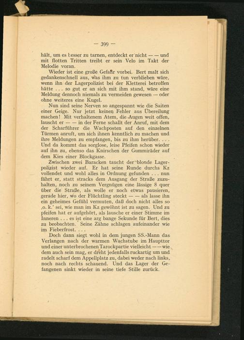 Zwischen zwei Baracken taucht der blonde Lagerpolizist wieder auf. Er hat seine Runde durchs Kz vollendet und wohl alles in Ordnung gefunden... nun fährt er, statt stracks dem Ausgang der Straße zuzuhalten, noch zu seinem Vergnügen eine lässige 8 quer über die Straße, als wolle er noch etwas pausieren, gerade hier, wo der Flüchtling steckt als lasse ihn ein geheimes Gefühl vermuten, daß doch nicht alles so , o. k.' sei, wie man im Kz gewöhnt ist zu sagen. Und zu pfeifen hat er aufgehört, als lausche er einer Stimme im Inneren... es ist eine arg bange Sekunde für Bert, dies zu beobachten. Seine Zähne schlagen aufeinander wie im Fieberfrost....