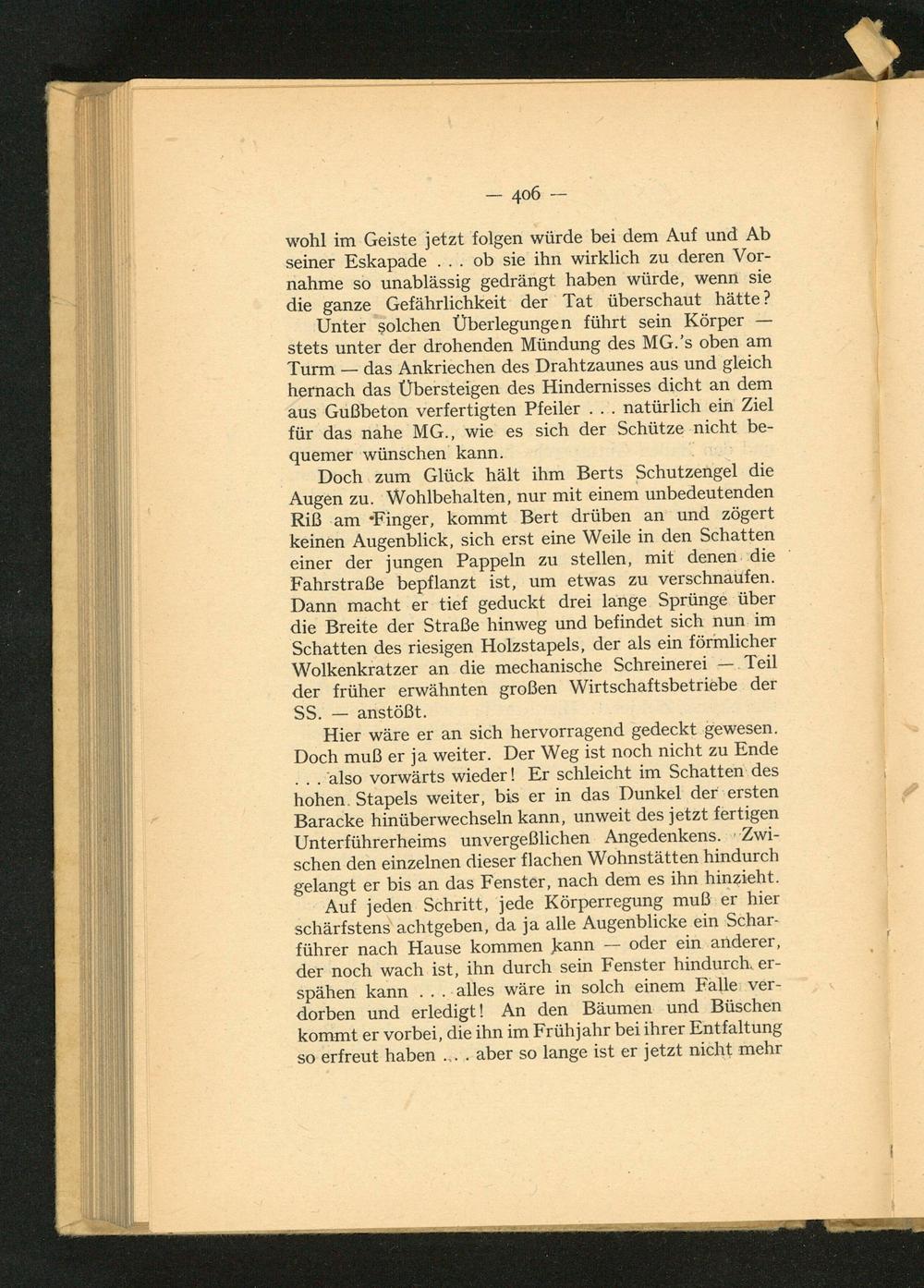 Doch zum Glück hält ihm Berts Schutzengel die Augen zu. Wohlbehalten, nur mit einem unbedeutenden Riß am Finger, kommt Bert drüben an und zögert keinen Augenblick, sich erst eine Weile in den Schatten einer der jungen Pappeln zu stellen, mit denen die Fahrstraße bepflanzt ist, um etwas zu verschnaufen. Dann macht er tief geduckt drei lange Sprünge über die Breite der Straße hinweg und befindet sich nun im Schatten des riesigen Holzstapels, der als ein förmlicher Wolkenkratzer an die mechanische Schreinerei- Teil der früher erwähnten großen Wirtschaftsbetriebe der SS. anstößt.