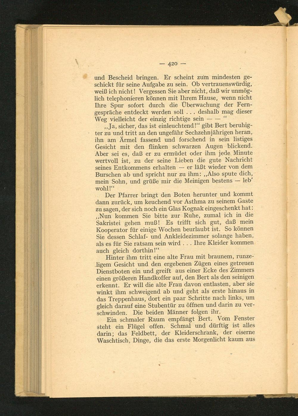 Der Pfarrer bringt den Boten herunter und kommt dann zurück, um keuchend vor Asthma zu seinem Gaste zu sagen, der sich noch ein Glas Kognak eingeschenkt hat: ,, Nun kommen Sie bitte zur Ruhe, zumal ich in die Sakristei gehen muß! Es trifft sich gut, daß mein Kooperator für einige Wochen beurlaubt ist. So können Sie dessen Schlaf- und Ankleidezimmer solange haben, als es für Sie ratsam sein wird... Ihre Kleider kommen auch gleich dorthin!"