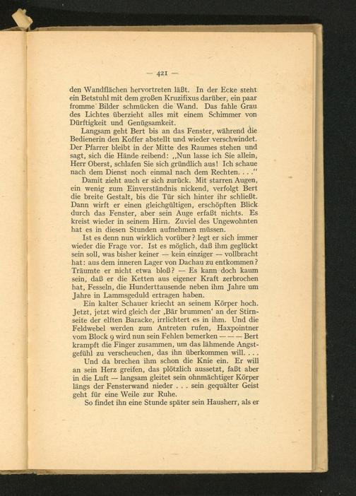 Ist es denn nun wirklich vorüber? legt er sich immer wieder die Frage vor. Ist es möglich, daß ihm geglückt sein soll, was bisher keiner— kein einziger— vollbracht hat: aus dem inneren Lager von Dachau zu entkommen? Träumte er nicht etwa bloß?— Es kann doch kaum sein, daß er die Ketten aus eigener Kraft zerbrochen hat, Fesseln, die Hunderttausende neben ihm Jahre um Jahre in Lammsgeduld ertragen haben.